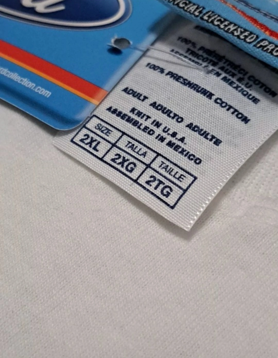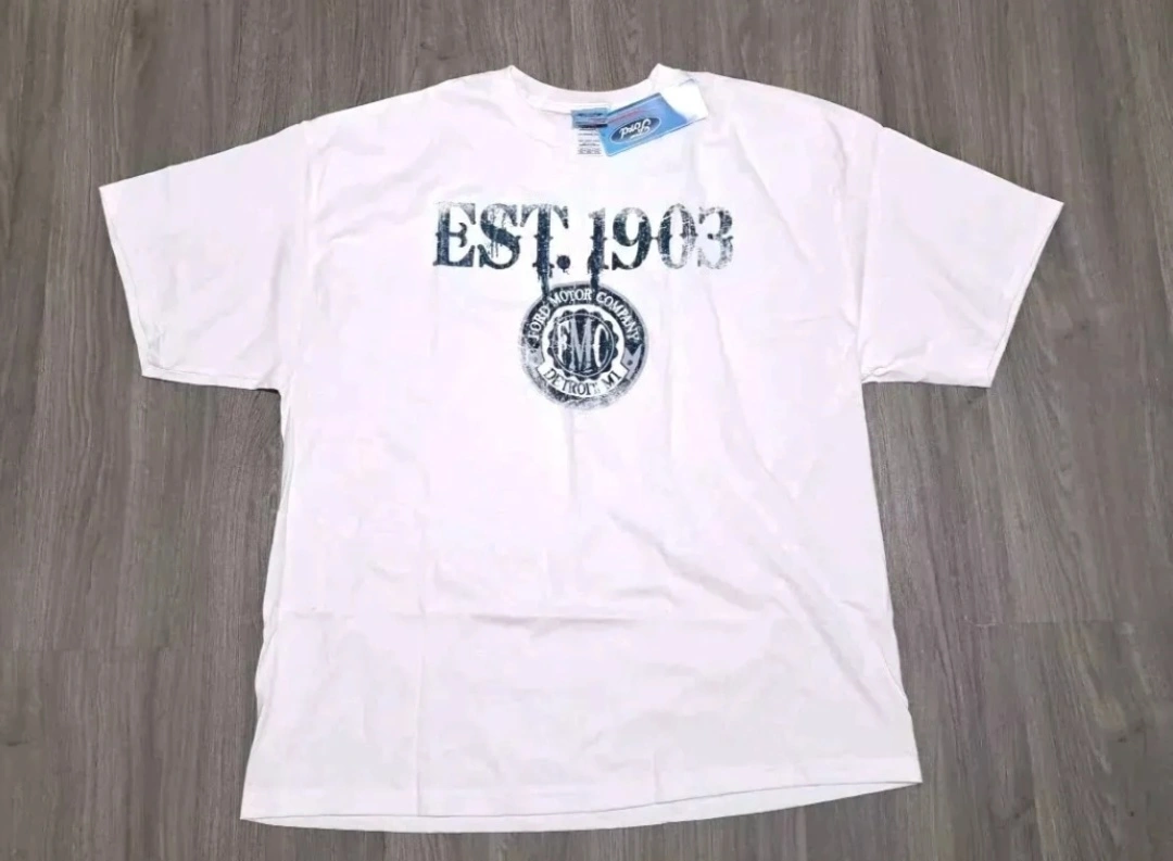 Men's white Ford Motor Company t-shirt. Features a vintage-style logo and 'Est. 1903' graphic. Size 2XL. Officially licensed product. New with tags. Knit in U.S.A., assembled in Mexico. brand new with tags*** P/U in Blackfalds