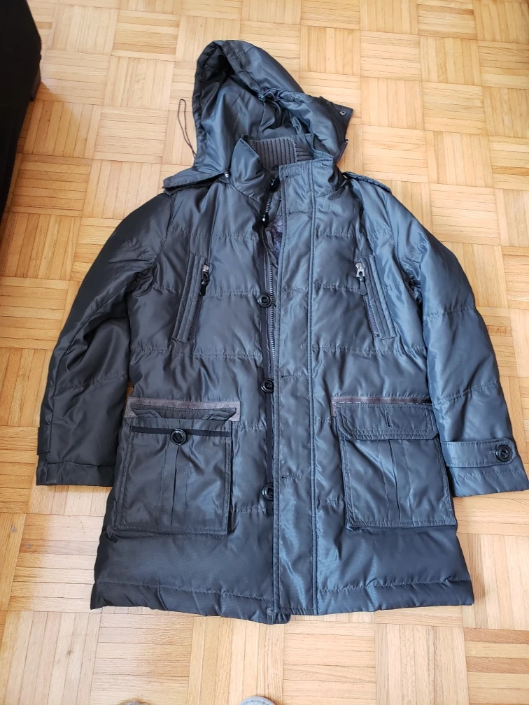 Black puffer jacket. Features a hood, zipper and button closure, multiple pockets. Good for cold weather.