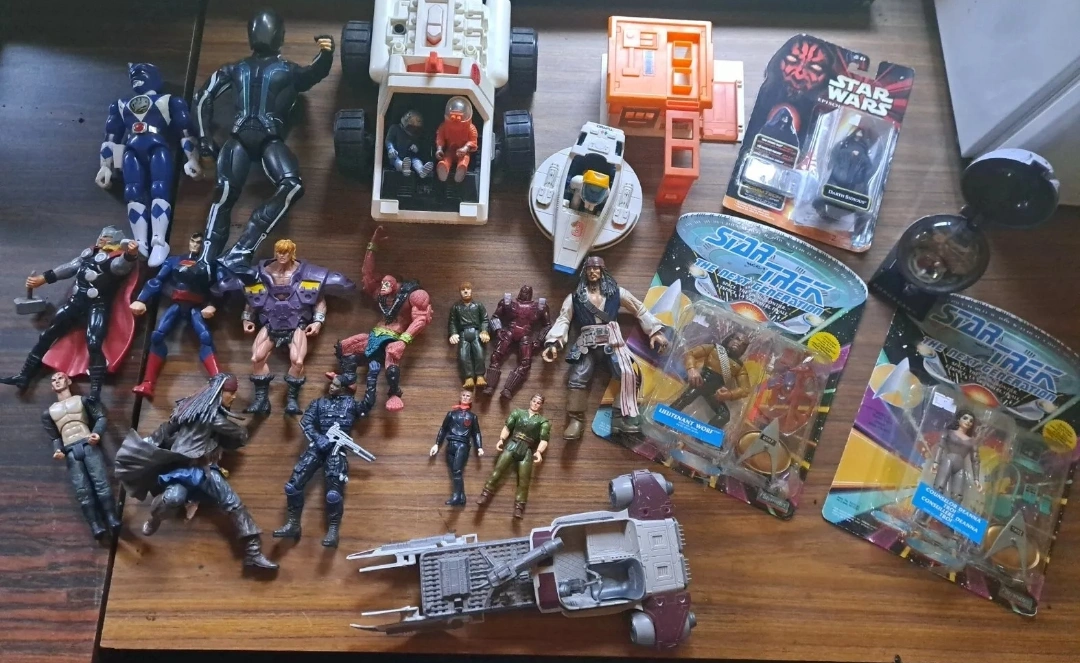 Collection of action figures and vehicles. Includes Star Wars, Star Trek, and other brands. Various characters and vehicles. Some figures appear to be from the Power Rangers and Marvel universes. Great for collectors or enthusiasts. P/U in Blackfalds
