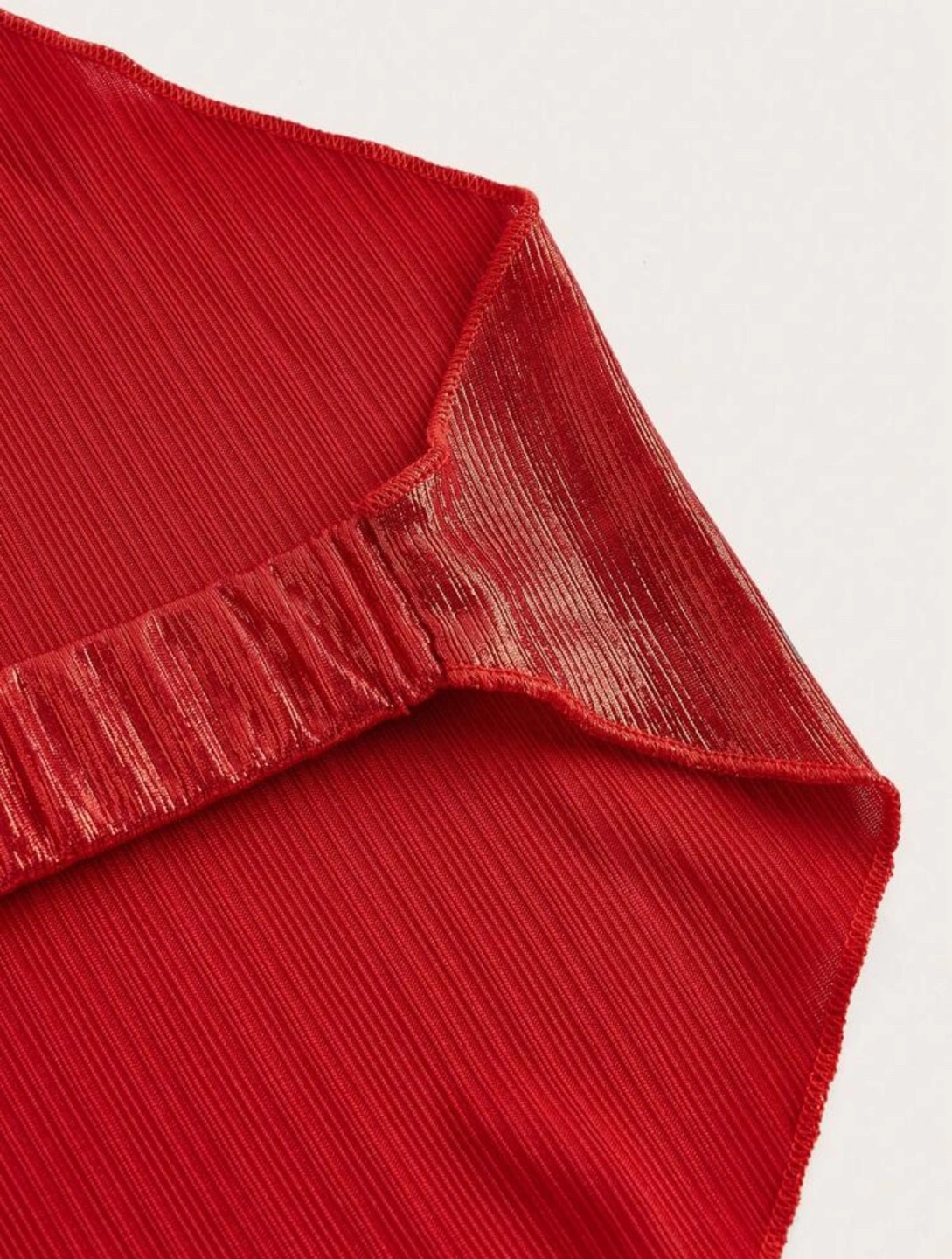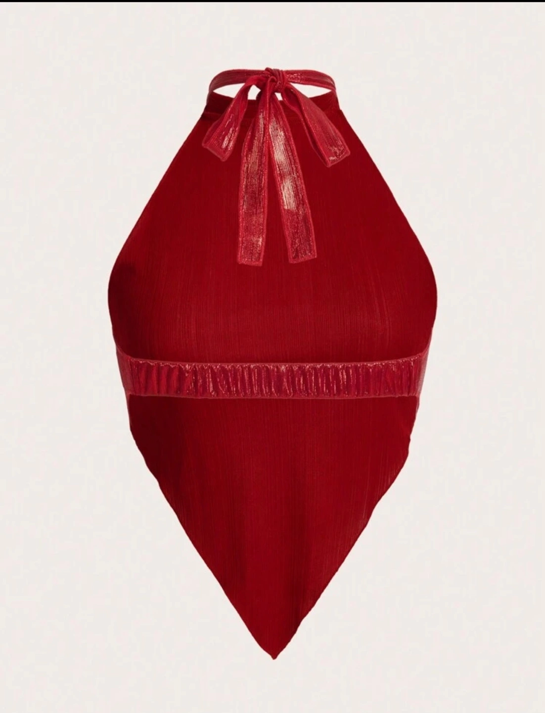 Stunning red metallic crop top. Halter neck design. Features a unique asymmetrical hemline. Great for a night out. New