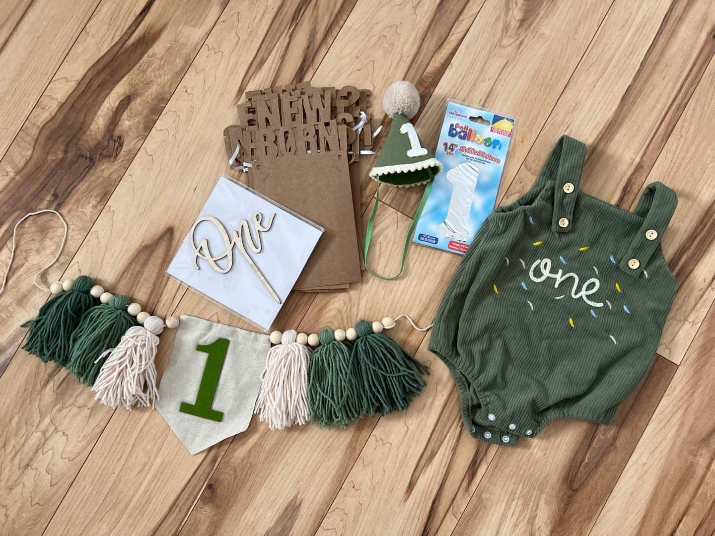 Adorable bundle for a first birthday celebration. Includes a twelve-month photo banner, number one cake topper, party hat, a one-piece outfit, and additional decorations. Perfect for capturing those precious memories. Comes from smoke free cat friendly home.