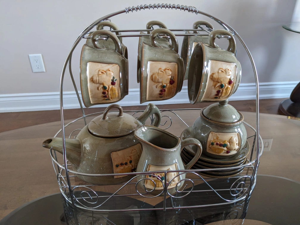 Tea set. All pieces feature a similar design. Metal stand included.
