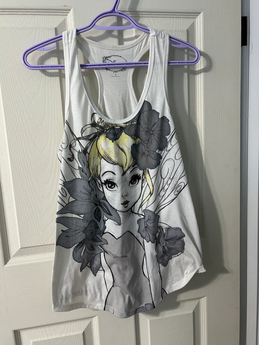 Women's size medium racerback tank top. Features a Tinkerbell graphic with flowers. White cotton blend.