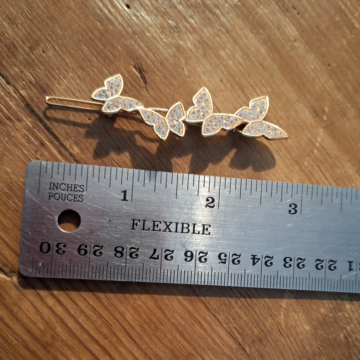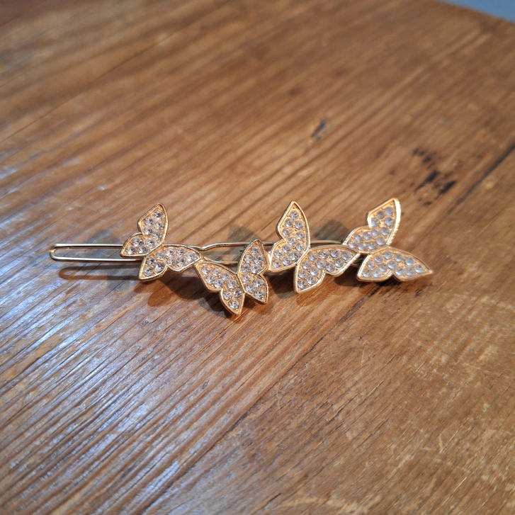 Three sparkly butterfly hair clip. Gold-tone metal. Rhinestone accents. Approximately 3 inches long.