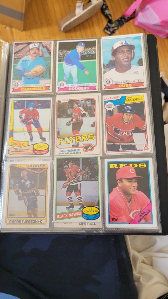 Large collection of vintage hockey and baseball trading cards. Various players and teams represented. Cards in a binder. 500