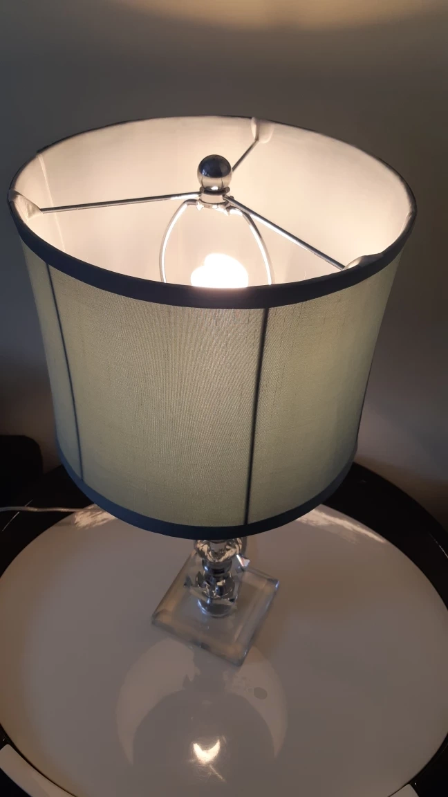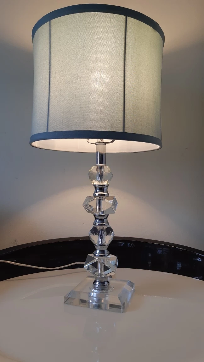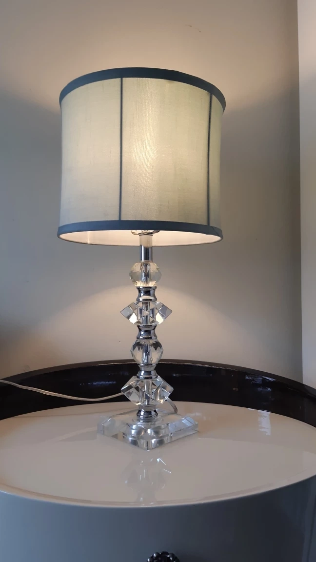 Elegant crystal table lamp. Features a clear crystal base and light green fabric shade. Modern design, perfect for bedside table or living room.