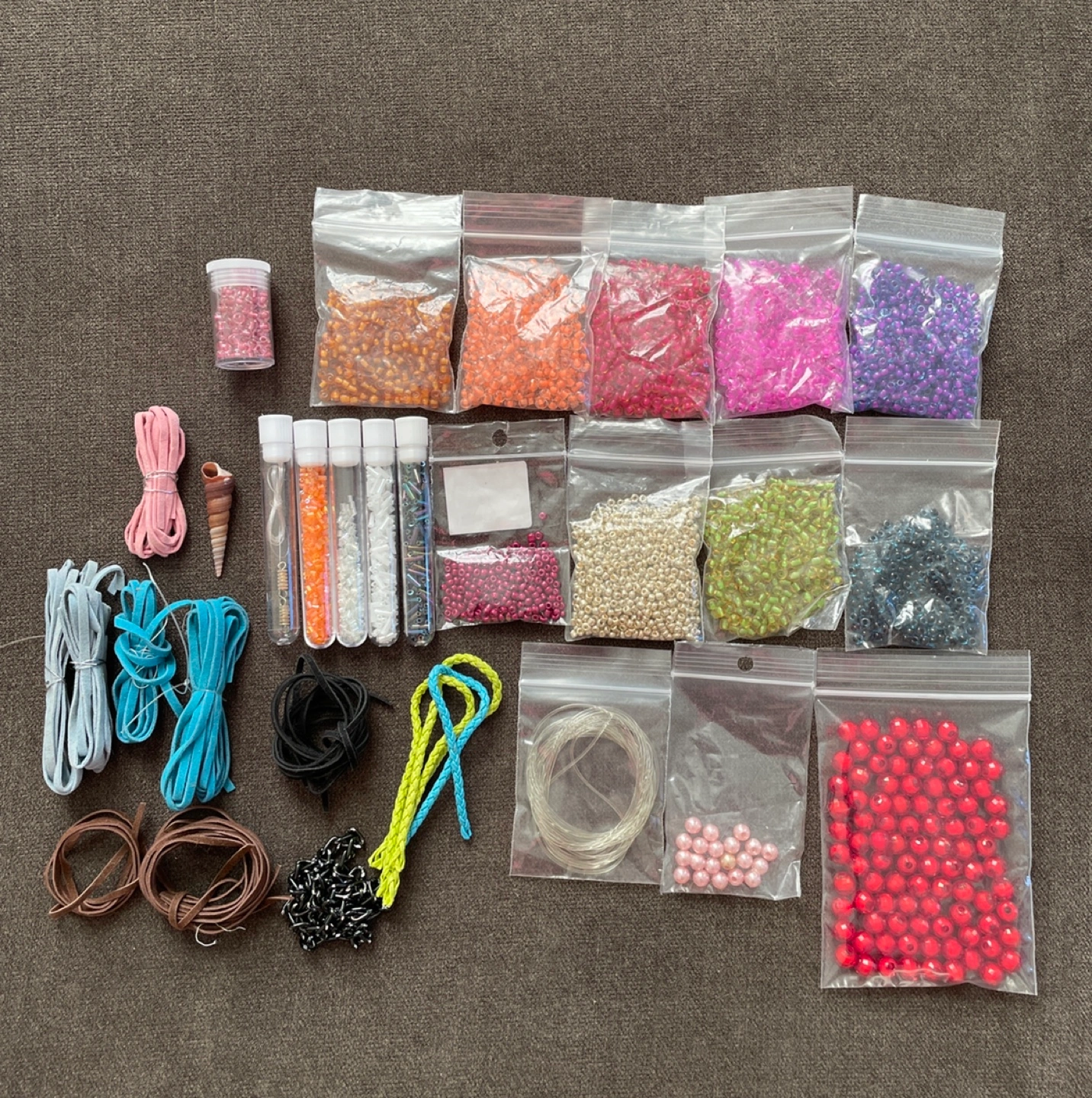 Large variety of beads in various colours and sizes. Includes different types of cords and chains. Perfect for crafting and jewellery making. Several small bags and containers of beads. Assorted colours and materials.