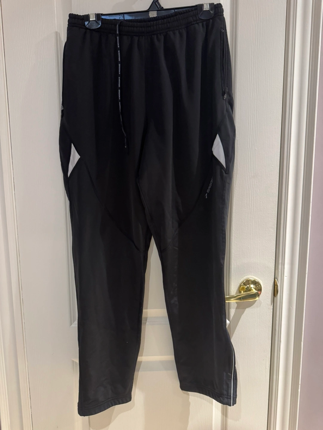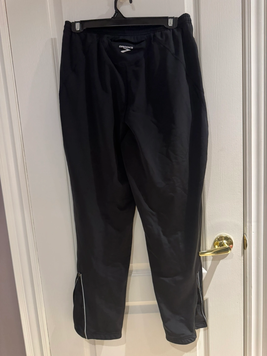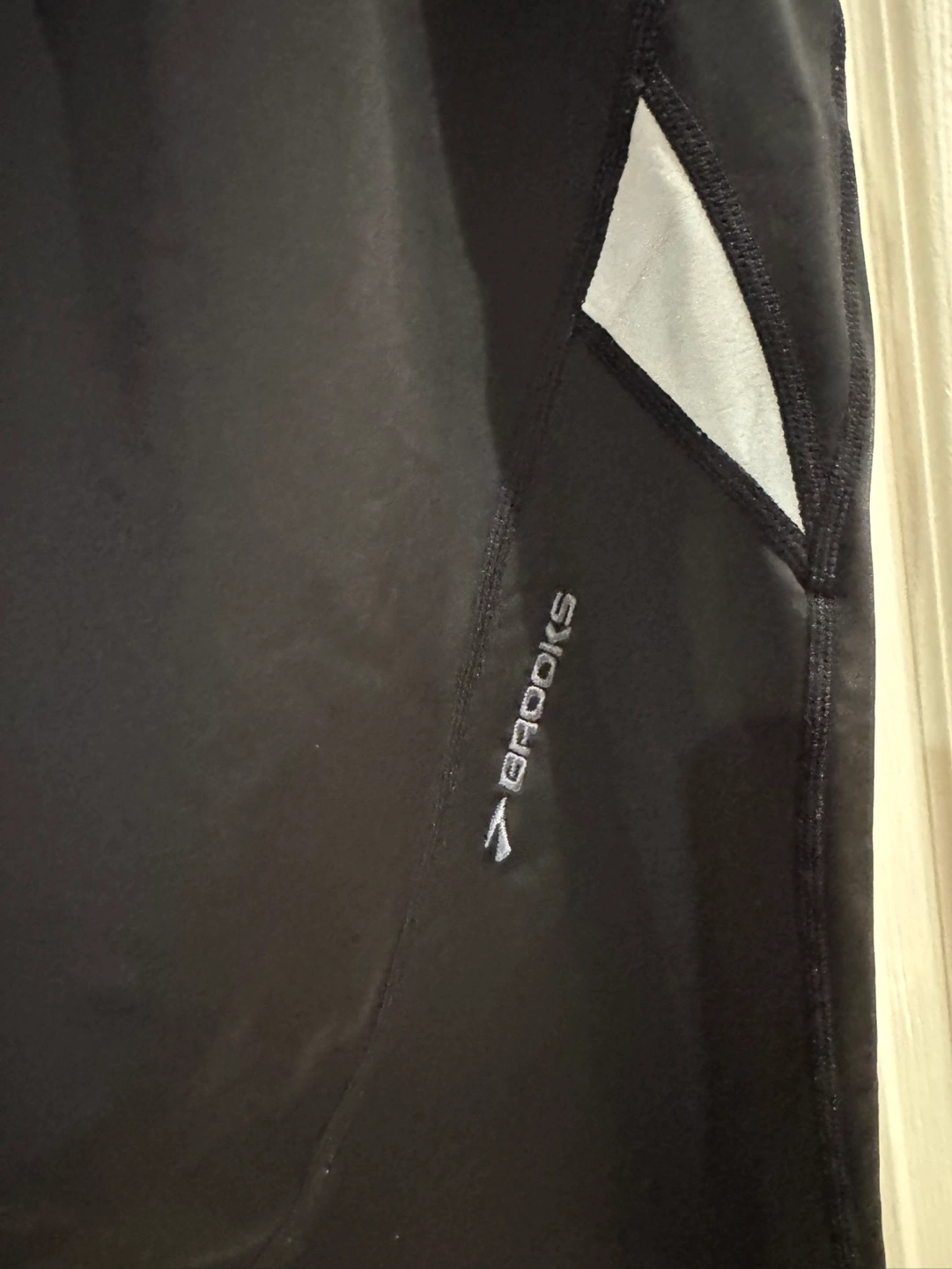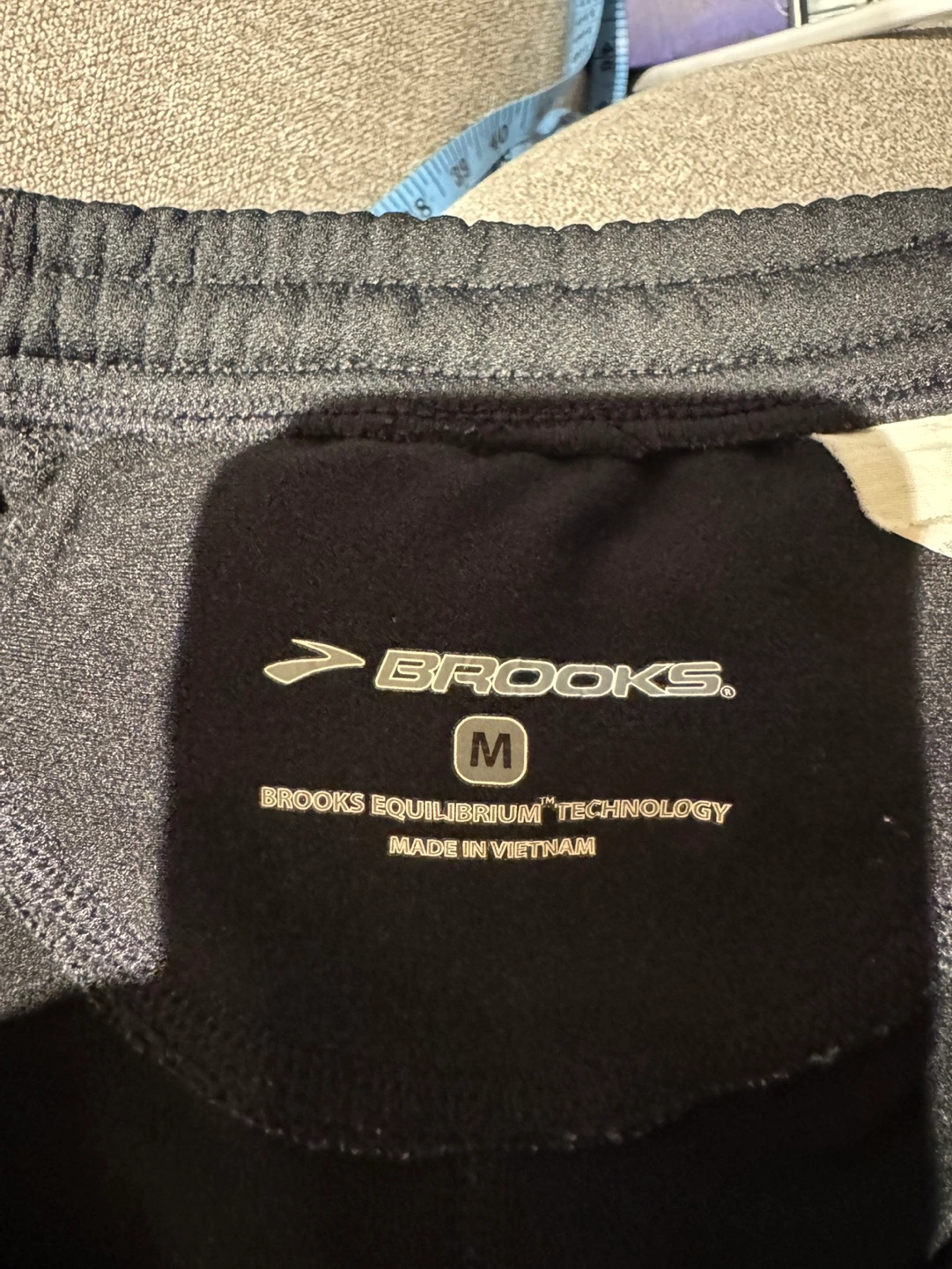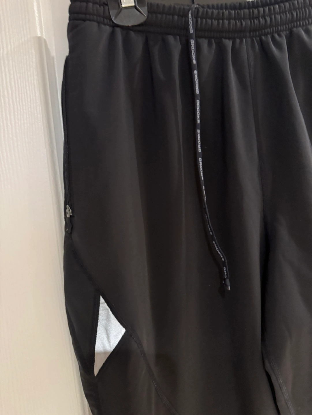 Black running pants. Size medium. Brooks Equilibrium technology. Made in Vietnam. Zippered pockets. Drawstring waistband. Reflective accents. Pick up in Woodbridge Islington and Rutherford