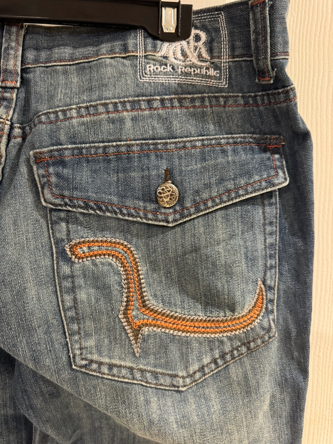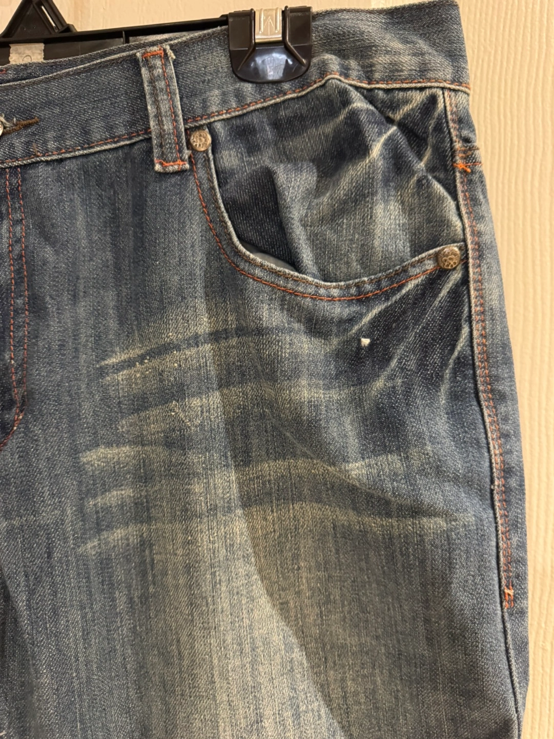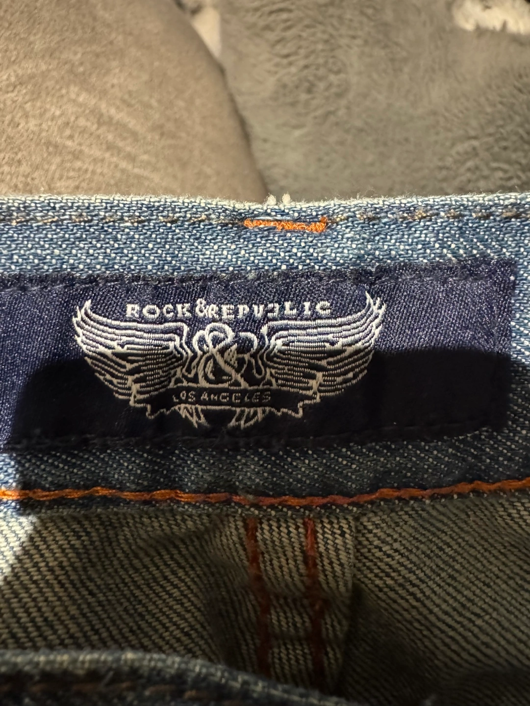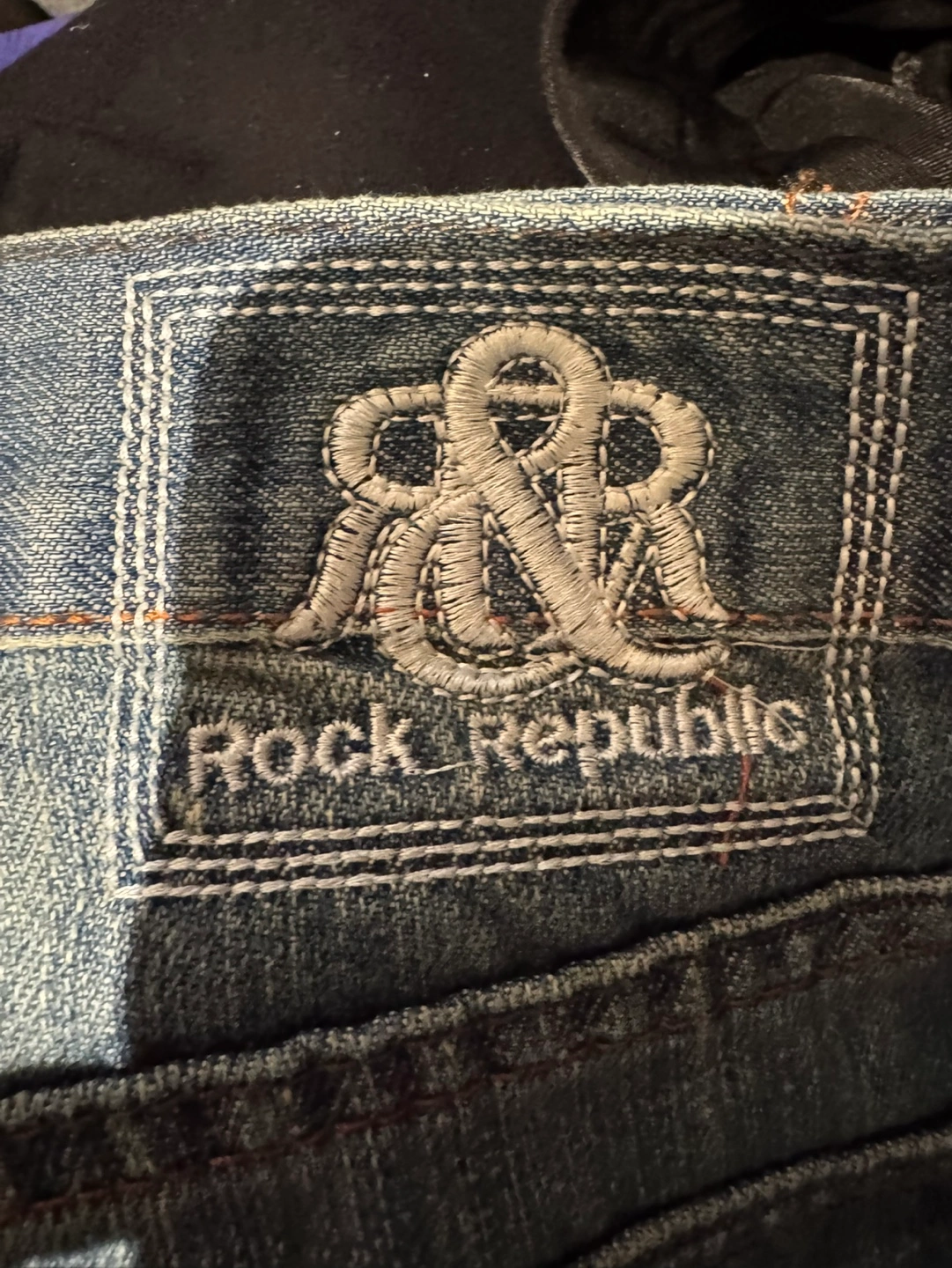 Men's Rock Republic jeans. Dark wash denim. Embroidered detailing on back pockets. Relaxed fit. Size 38x38 Pick up in Woodbridge Islington and Rutherford