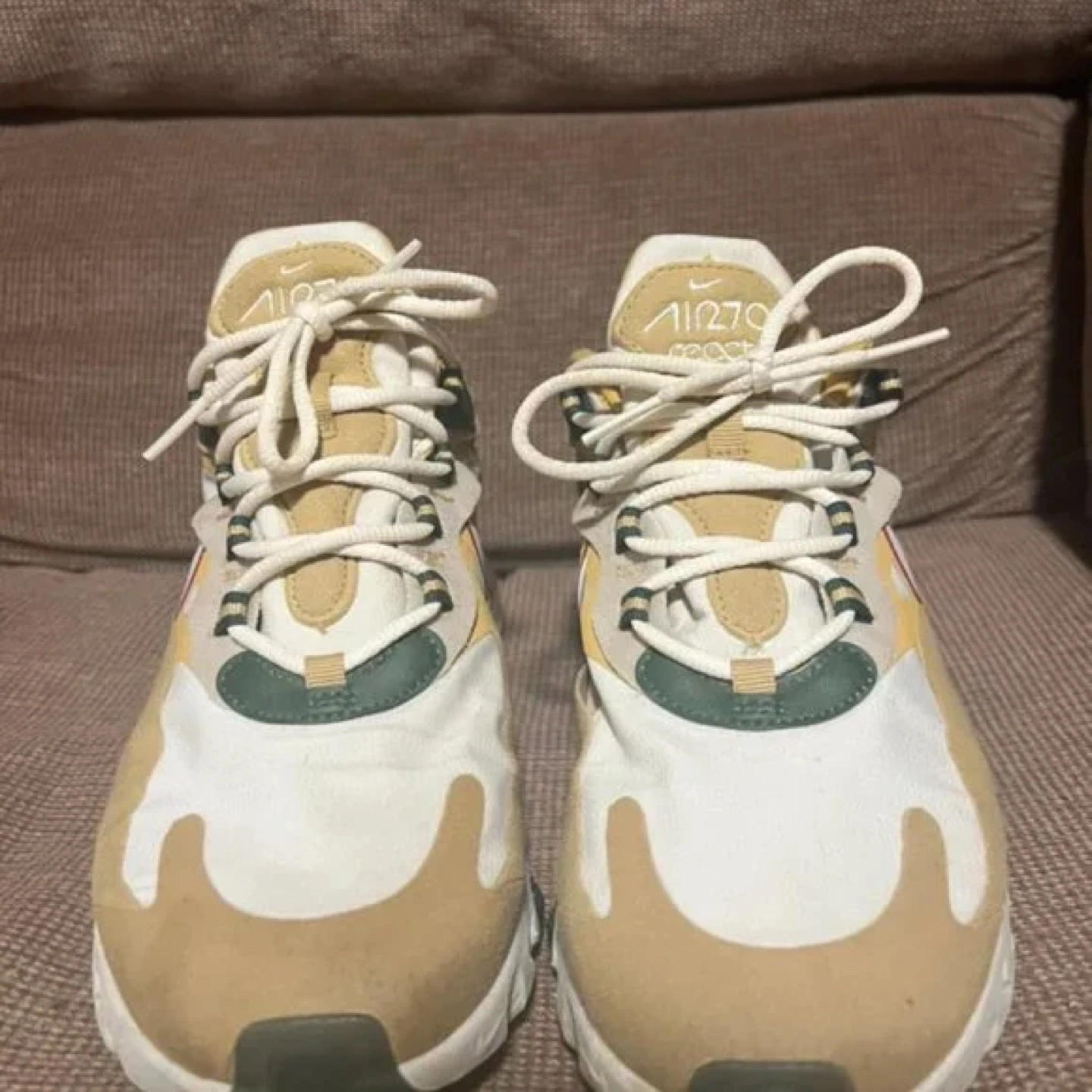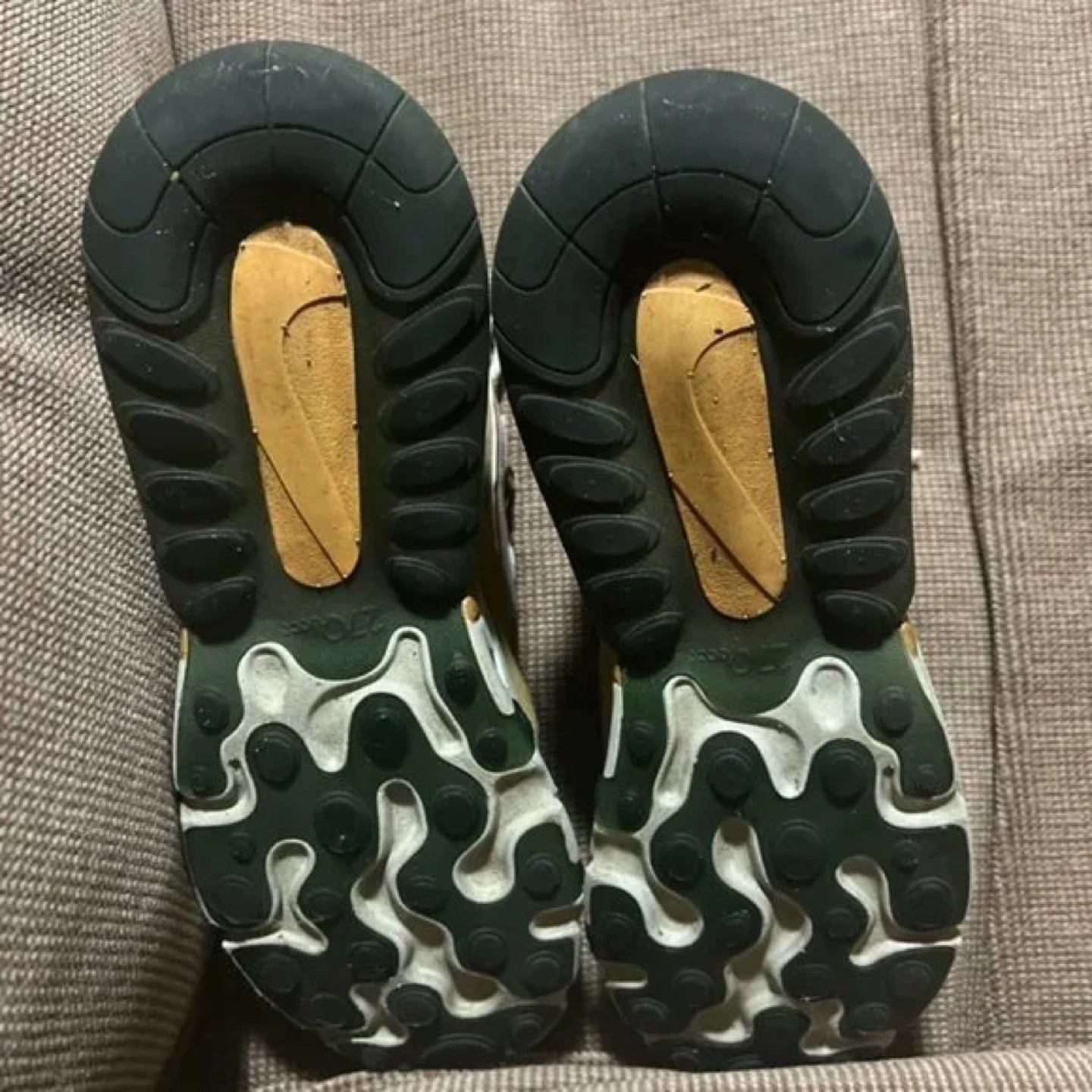 Pre-owned Nike Air Max 270 React running shoes. Tan, white, and green colour scheme. Minimal wear. Good condition. Comfortable and stylish. NIKE AIR 270 REACT GOLD/DARK GREEN Excellent Condition Gold/Dark Green 6.5 Cash McNicoll & Midland Area Pickup (3720 Midland Avenue, Toronto, CA M1V 4V3) Pet & Smoke Free Home ๐ก Sanitized and Washed Thoroughly ๐งบ Bundle to Save Up to 15% ๐ Offers and Questions are Welcome ๐