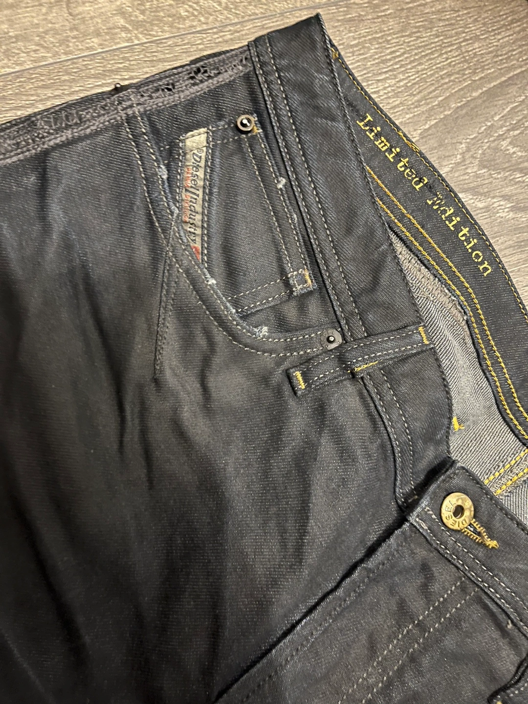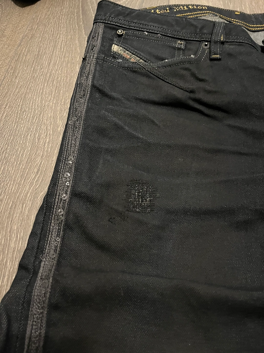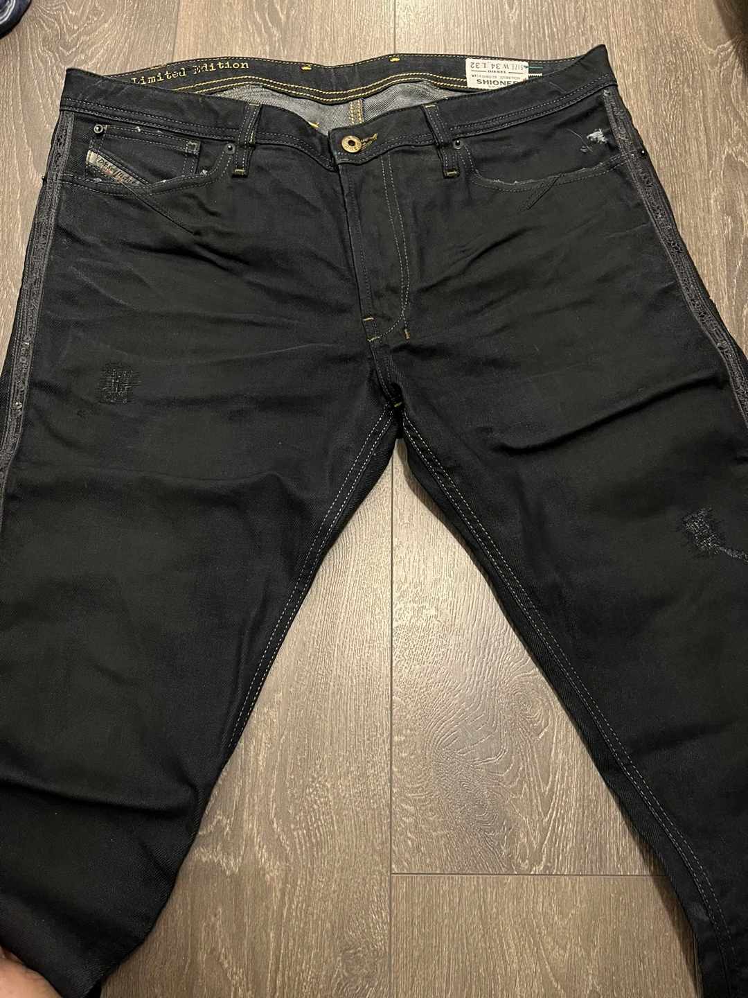 Men's black Diesel Shoner jeans. Limited edition. Size 34/32. Slim fit, with shiny border on legs - great as party wear.