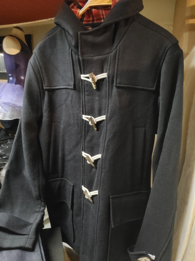 Classic black duffle coat. Features a hood, toggle fasteners, and pockets. Great for colder weather.