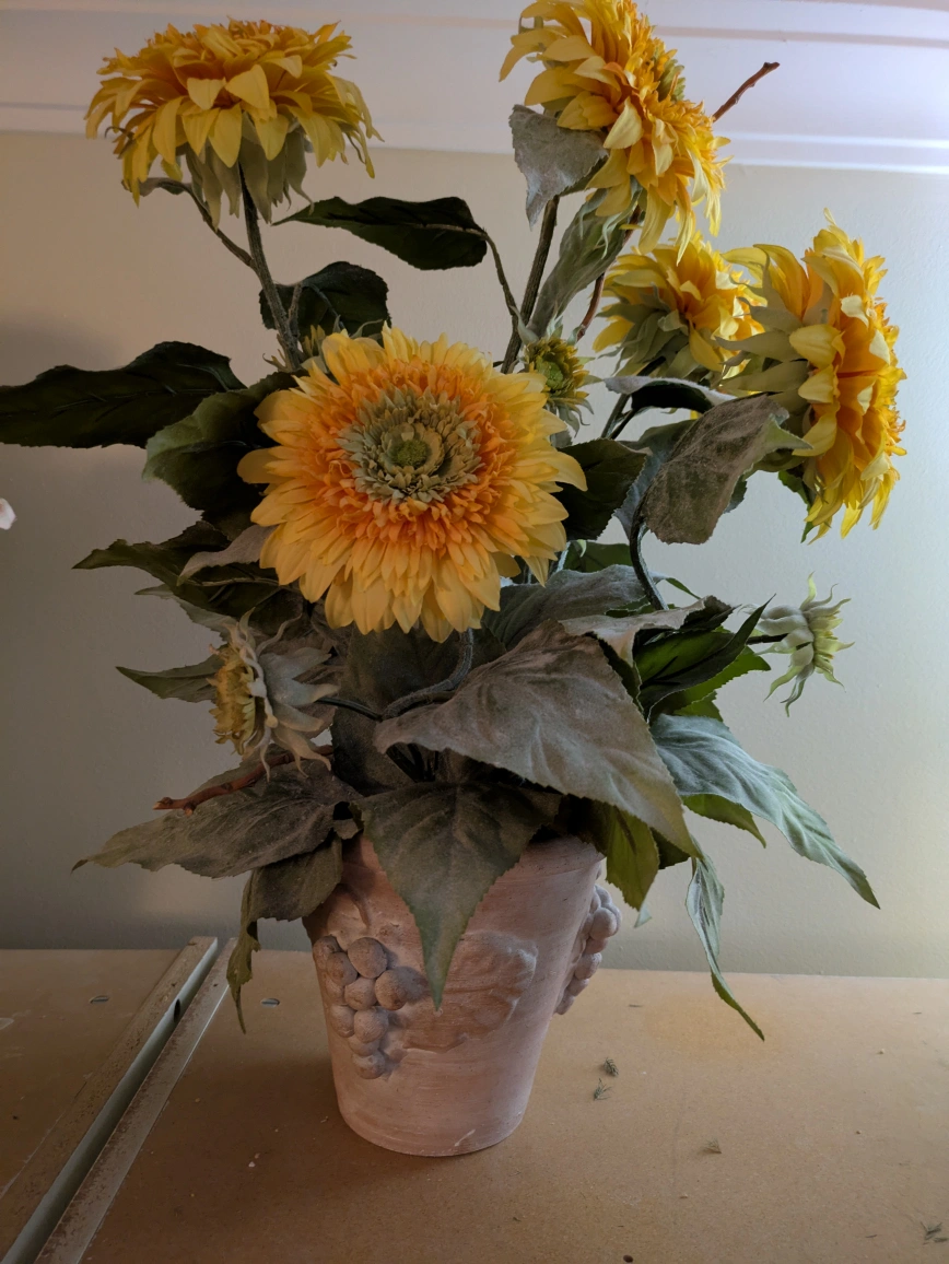 Lovely artificial sunflower arrangement. Planted in a beige terracotta-style pot with grape embellishments. Perfect home dΓ©cor.