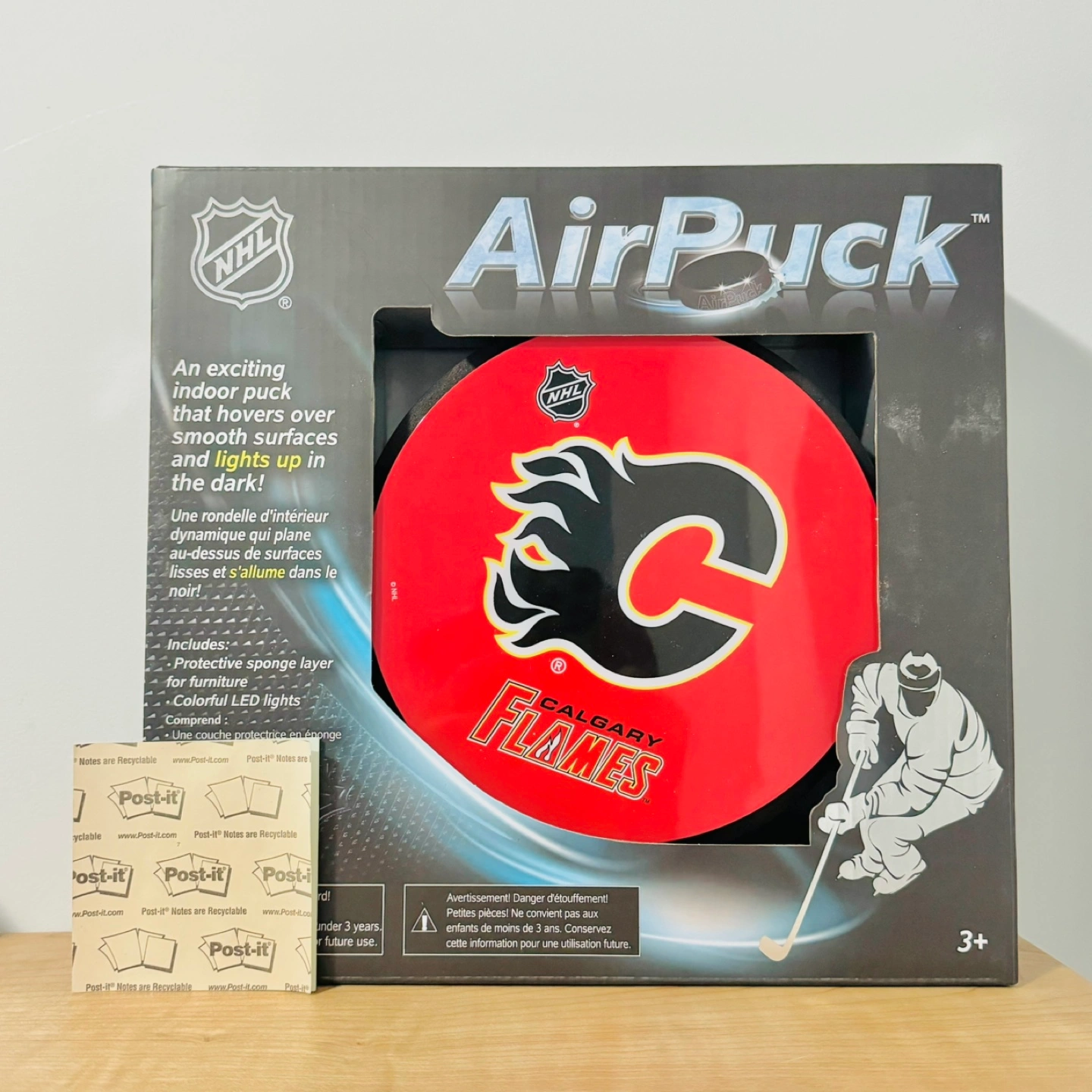 Selling brand new NHL Calgary Flames Air Puck. NHL Hockey licensed toy that hovers over a curtain of air. Easily float over smooth surfaces. Features: - Lights up and glows in the dark - Thick foam bumper - Hovers over smooth surfaces Specifications: - Item Height: 10.25 inches - Item Length: 10.75 inches - Item Width: 3.00 inches - Takes 4x AA Batteries