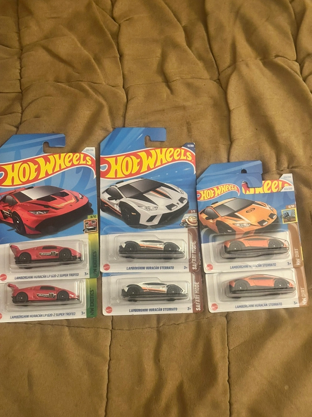Five collectible Hot Wheels Lamborghini cars. Includes Lamborghini Huracán LP 620-2 Super Trofeo (red and orange), Lamborghini Huracán Sterrato (orange), '16 Lamborghini Centenario Roadster (grey), and Lamborghini Sesto Elemento (white). All in original packaging. Great for collectors.