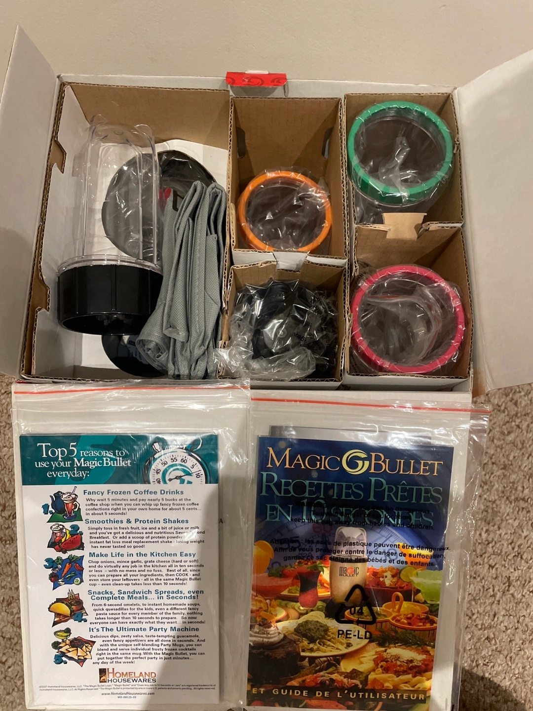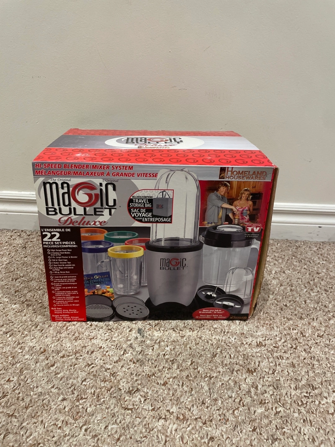 Brand new, lightly used Magic Bullet Deluxe high-speed blender and mixer system. Includes 22 pieces. Perfect for smoothies, frozen drinks, and more. Comes with recipe booklet and instruction manual. Great for small spaces.