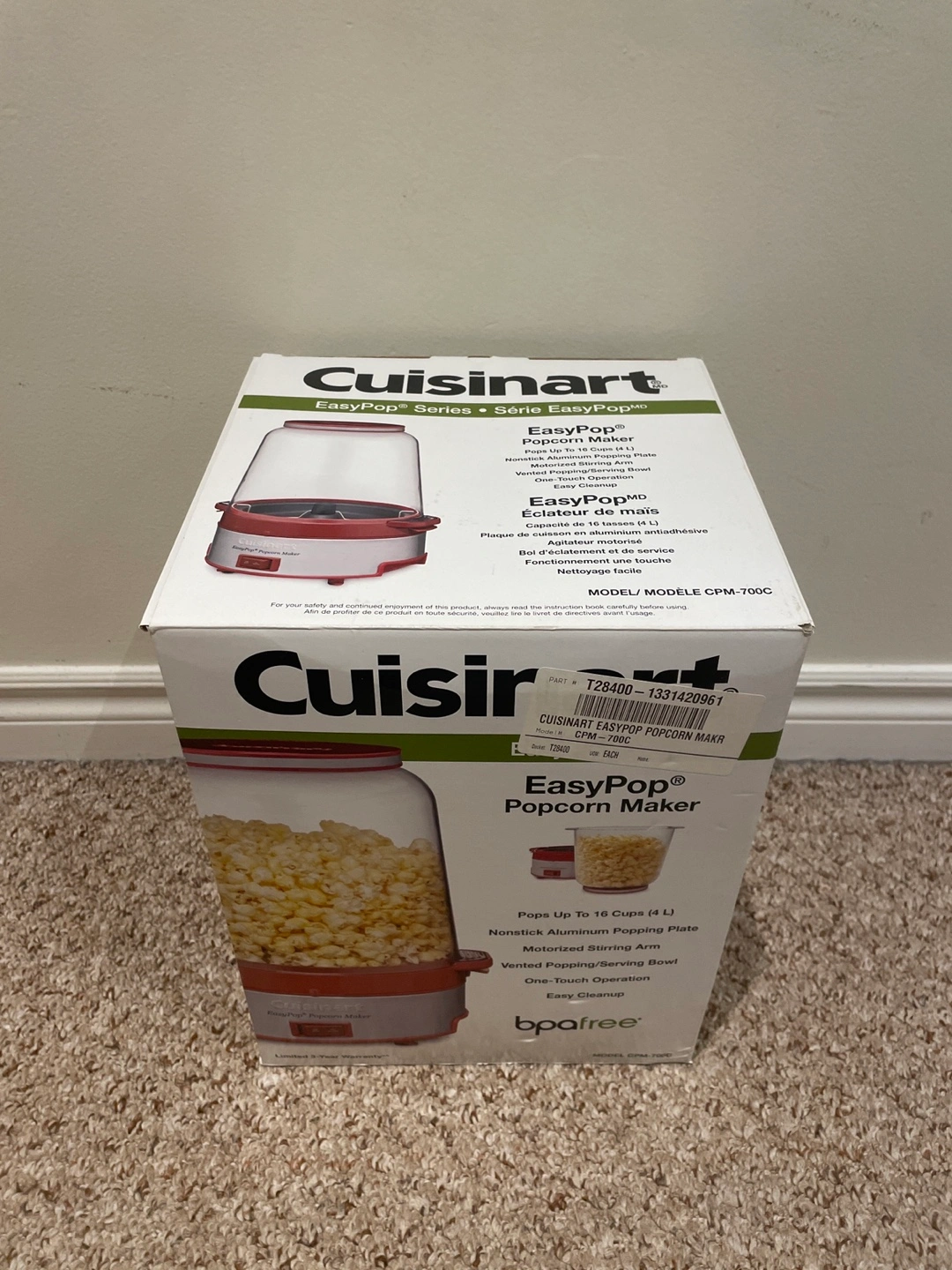 Brand new Cuisinart EasyPop popcorn maker. Model CPM-70GC. Makes up to 16 cups. Non-stick aluminum popping plate. Vented popping/serving bowl. Easy clean.