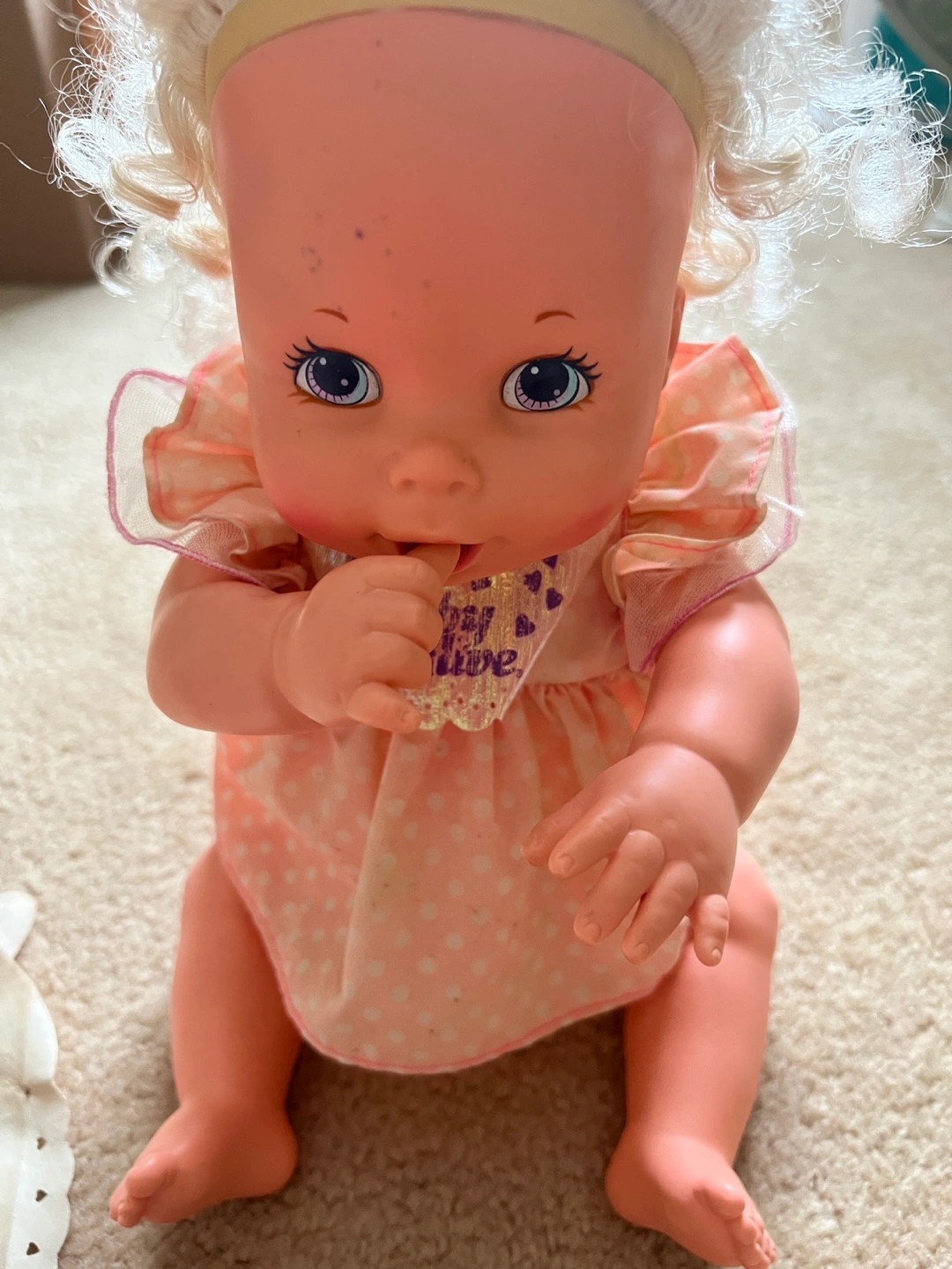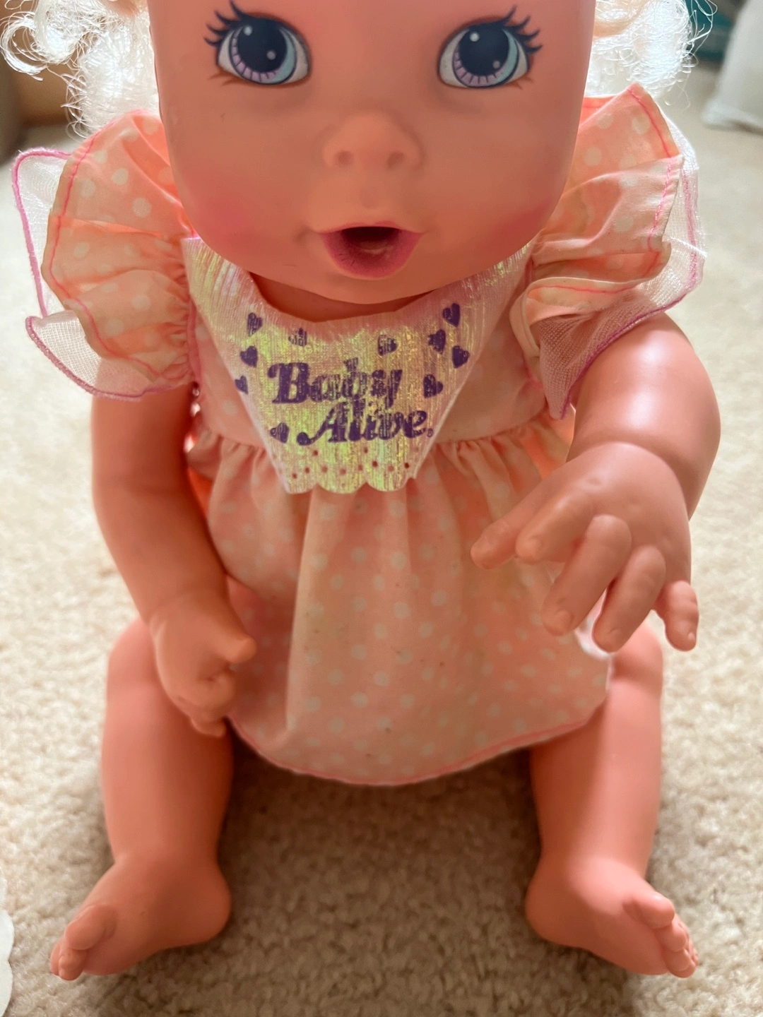 Adorable vintage Baby Alive doll. Includes two plates, spoons, two bottles and extra bib. Great for collectors or playtime. Vintage Baby Alive 1990’s Kenner doll Blond hair and blue eyes With two bottles Two bowls with spoons Bib and dress Shows wear for the age of the doll Marks on her face Smoke free home Pick up near Glenanna Road and Hwy 2 If ad is still up it’s available