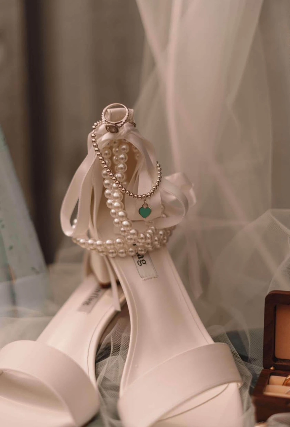 White high-heeled sandals. Pearl embellishments and a satin bow. Elegant and suitable for weddings or formal events. Size 8, not meant for wide feet