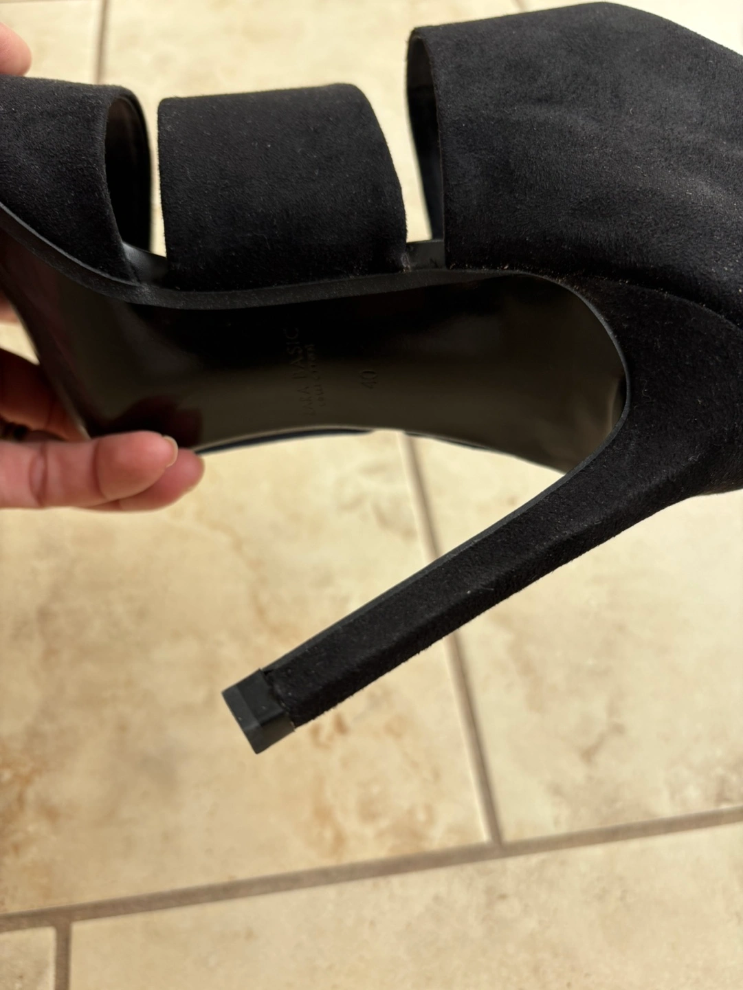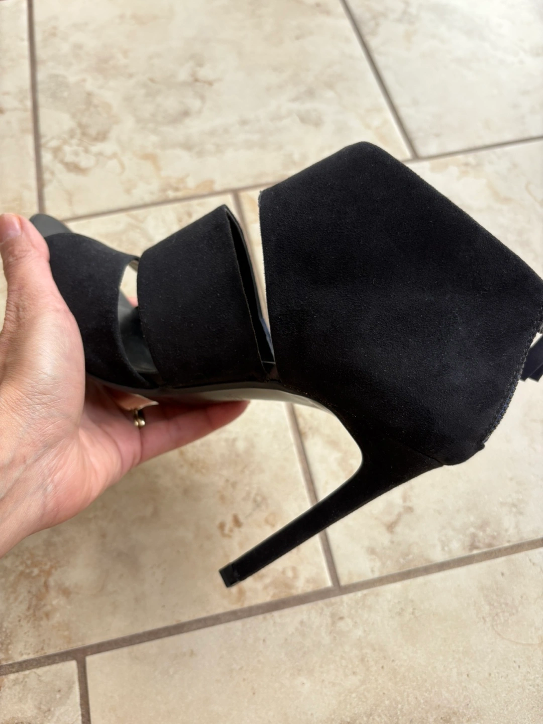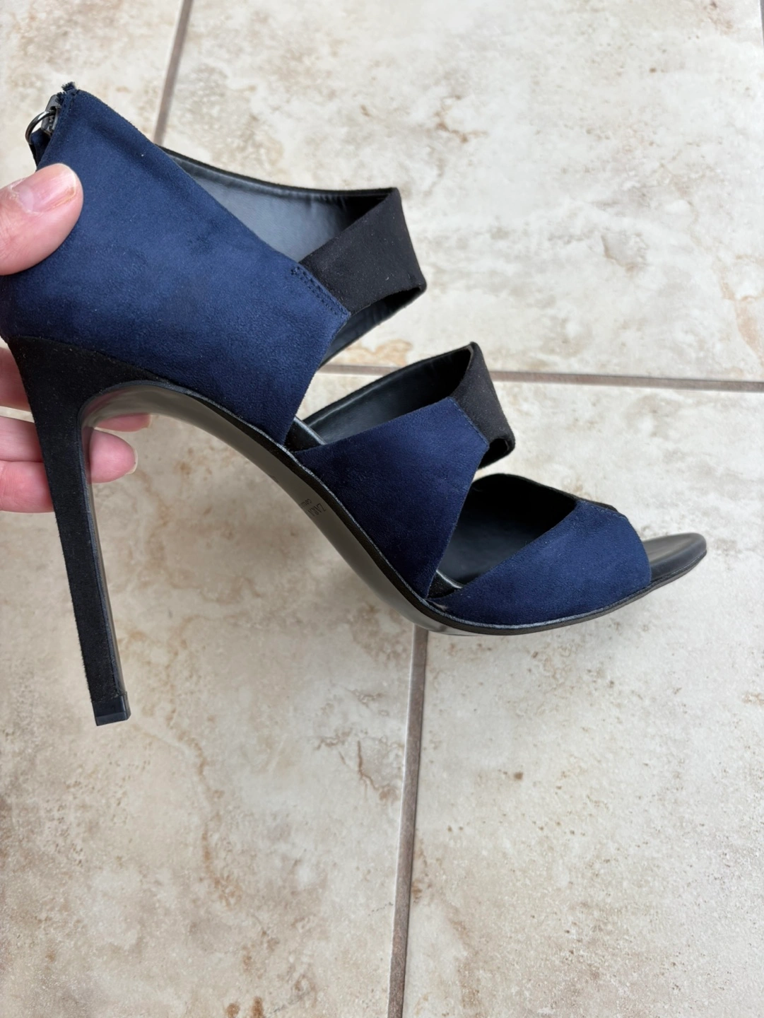 Beautiful black and navy suede high heels. Open-toe design. Suede upper. Stiletto heels. Back zipper closure. Never worn Size 9
