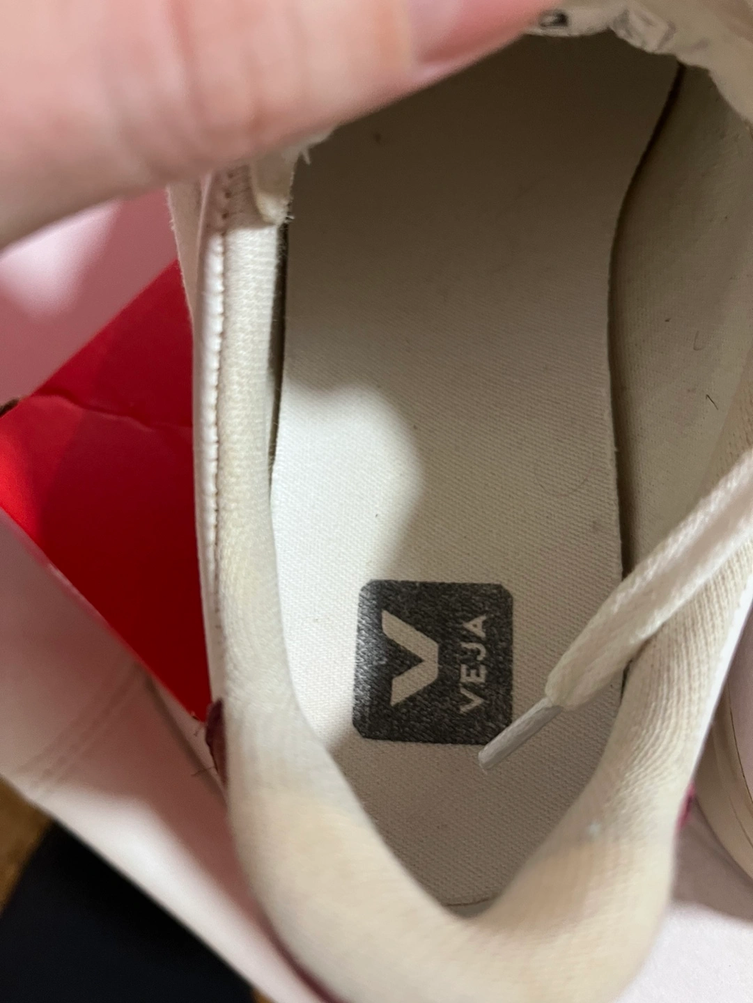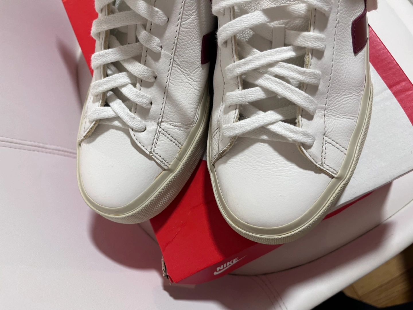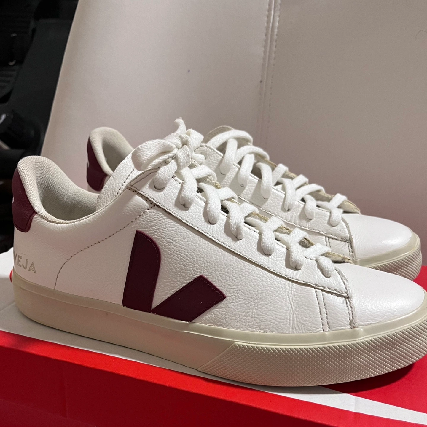 Women's VEJA Esplar sneakers. US8 Eur 39 Uk 7 White leather upper with burgundy V logo. Cream coloured sole. Low-top style. Lace-up closure. Like new. Payed 210+ tax Pickup close to Davisville subway station, 6min walk.