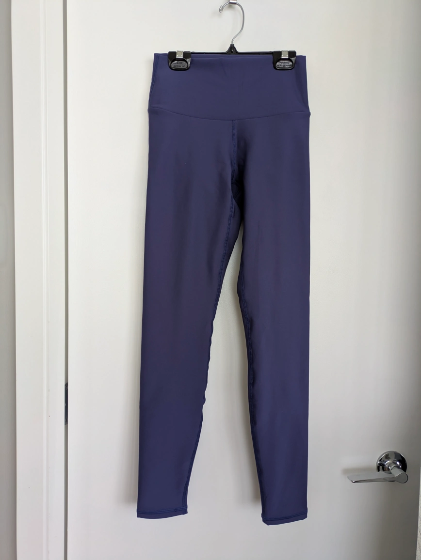 High-waisted leggings. Midnight blue colour. Size small. Made in Canada from recycled plastic bottles. Soft and stretchy fabric.