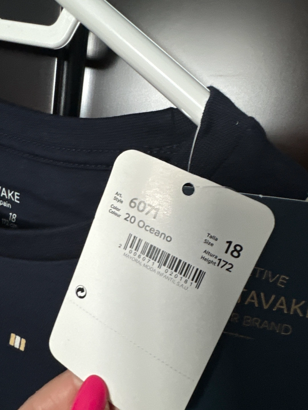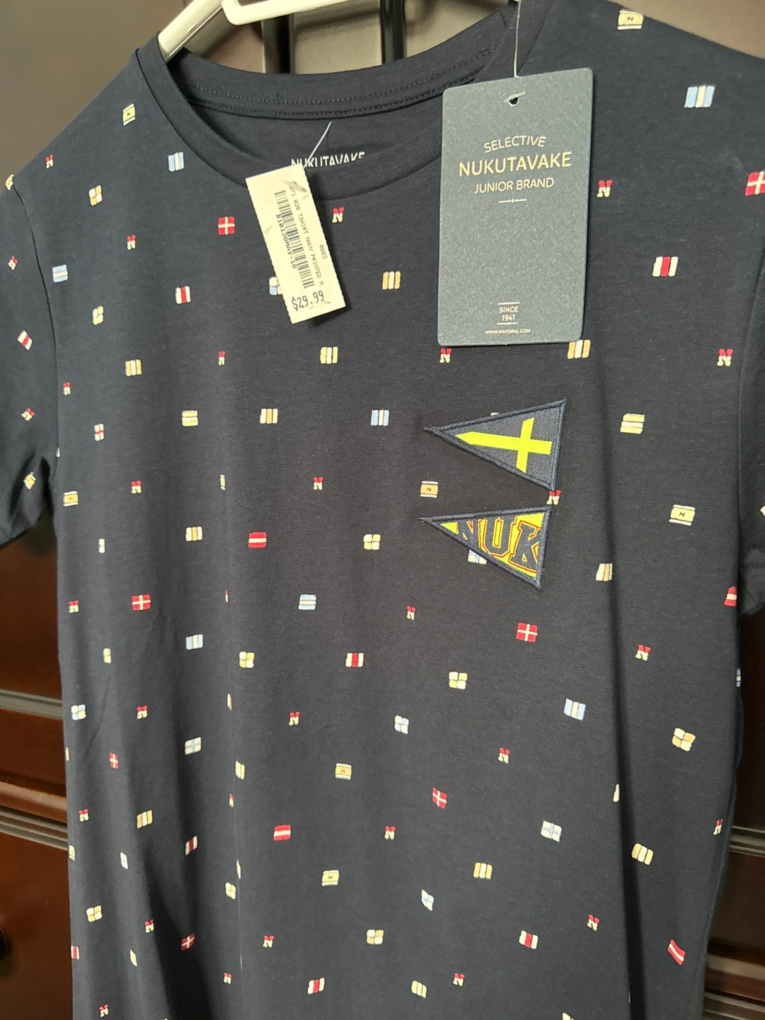 Boy's dark navy blue t-shirt. Features a small pennant patch and an all-over print of miniature international maritime signal flags. Size 18. New with tags.