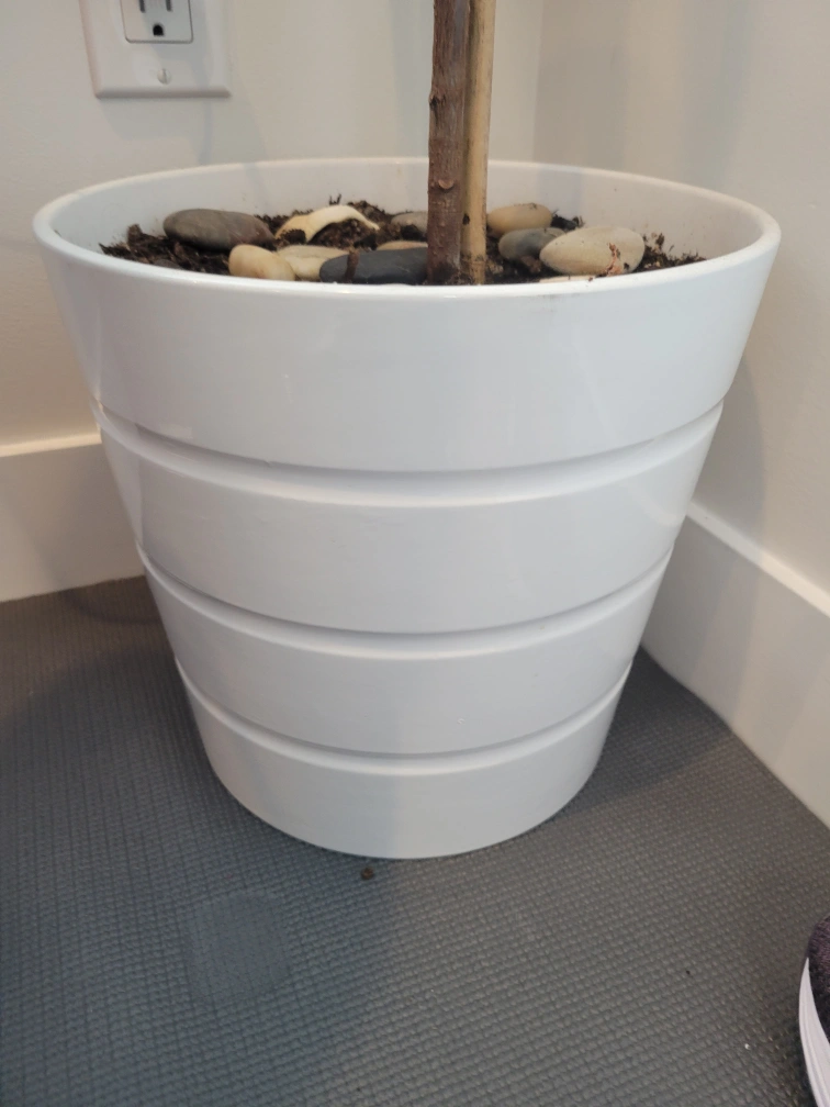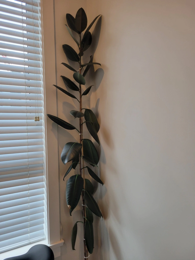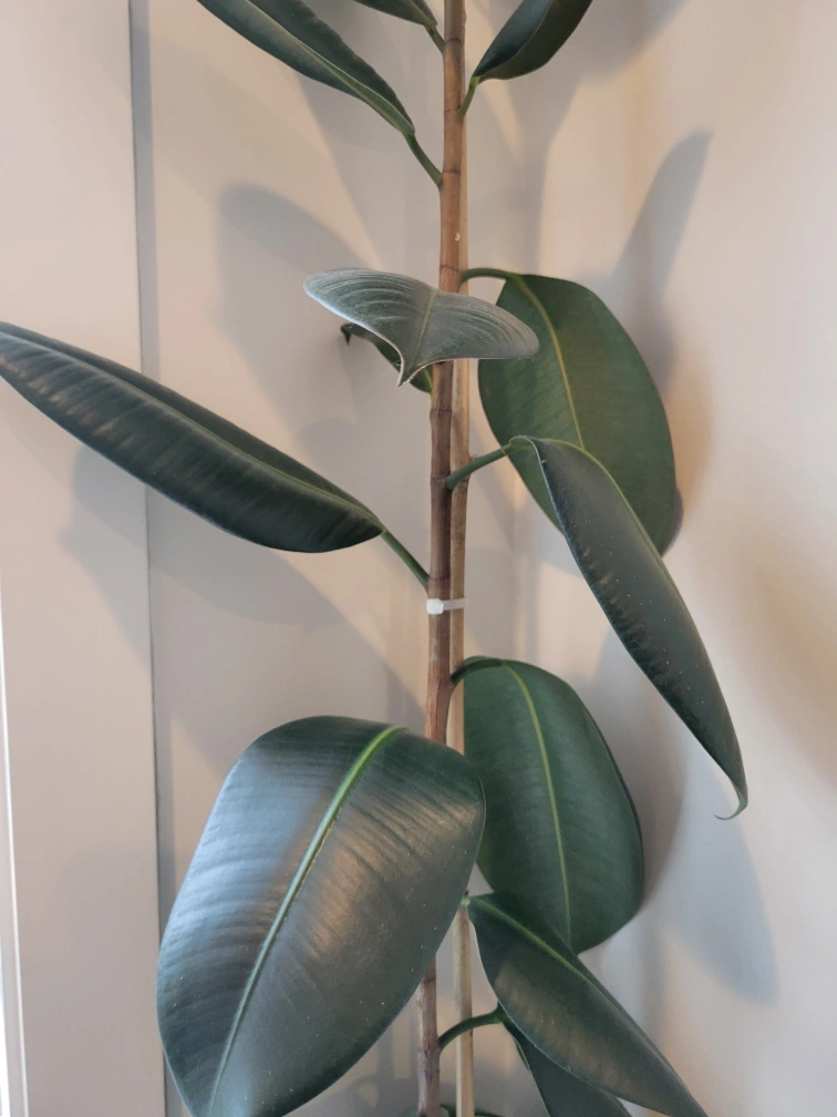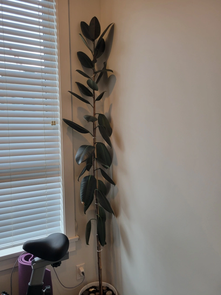 Large rubber plant, approximately 7 feet tall. Planted in a white ceramic pot. Healthy.