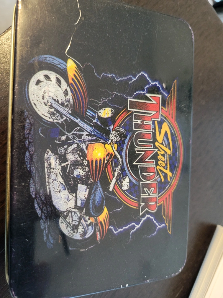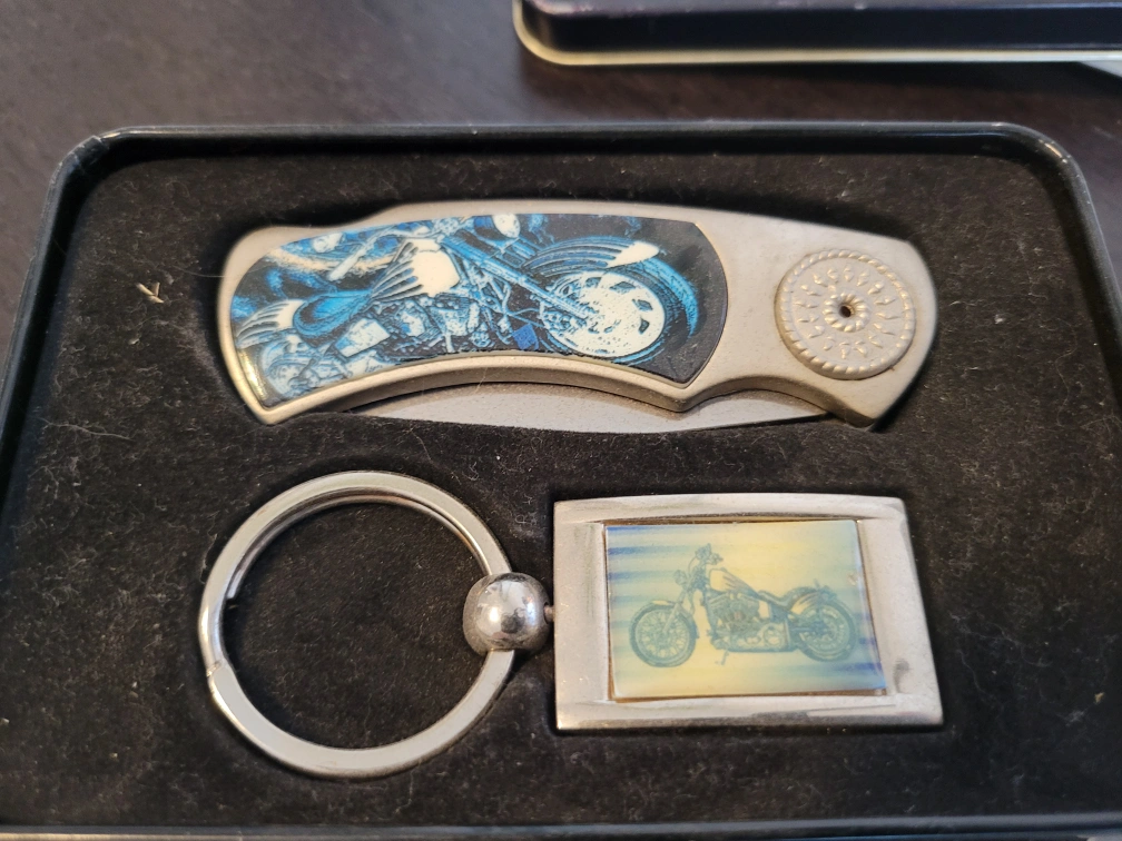 Cool pocket k Ni fe and matching keychain set. Features a motorcycle design. Comes in original tin. Perfect gift or collector's item.