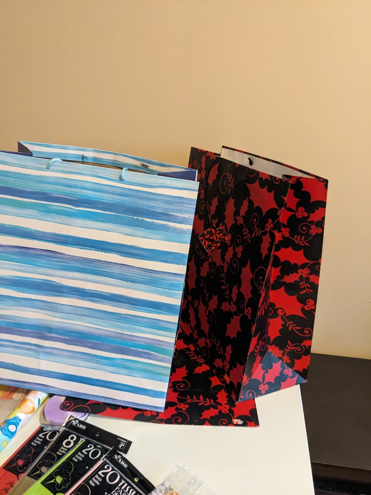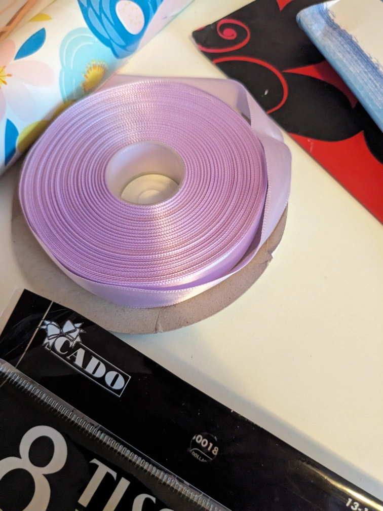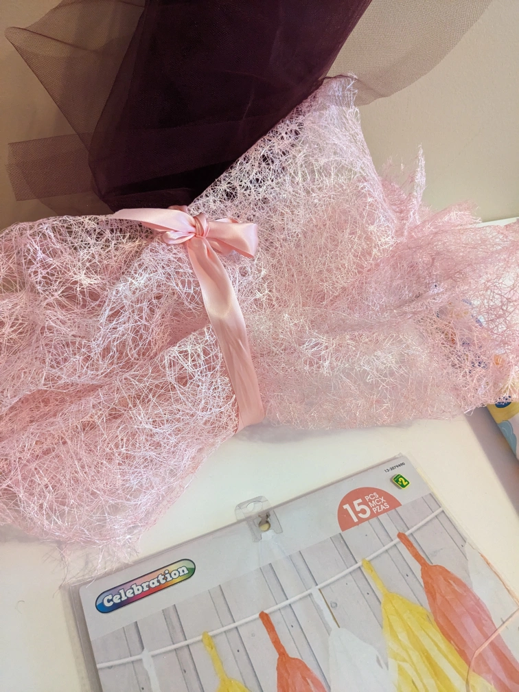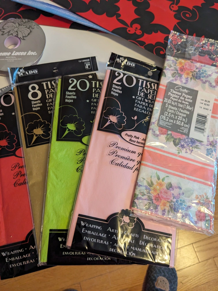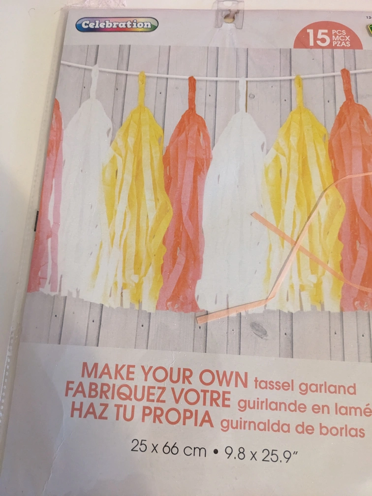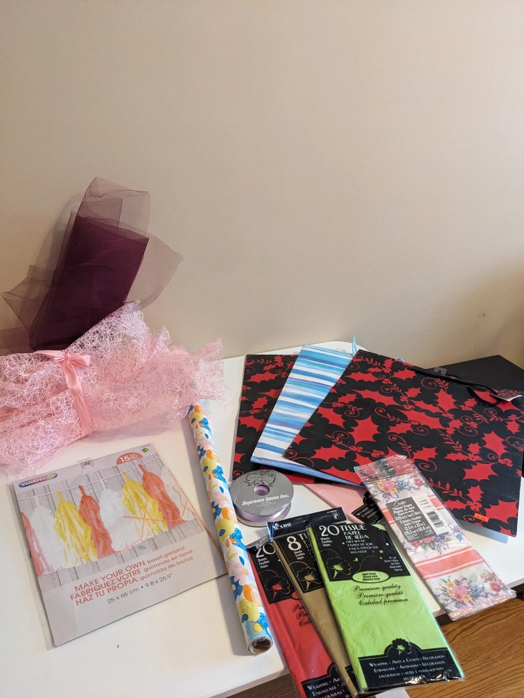 Assorted party or crafting materials including tissue paper, gift bags, ribbon, wrapping paper, and a tassel garland. Mostly new or excellent condition. Perfect for gift wrapping, DIY projects, or party decorations. Bulk purchase for a great price.