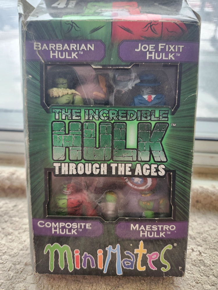 Mini Mates Incredible Hulk Through The Ages boxed set. Includes multiple figures and accessories. Bonus figures included: Chun-Li, She-Hulk, another Hulk variant, and others. Extra accessories and pieces.