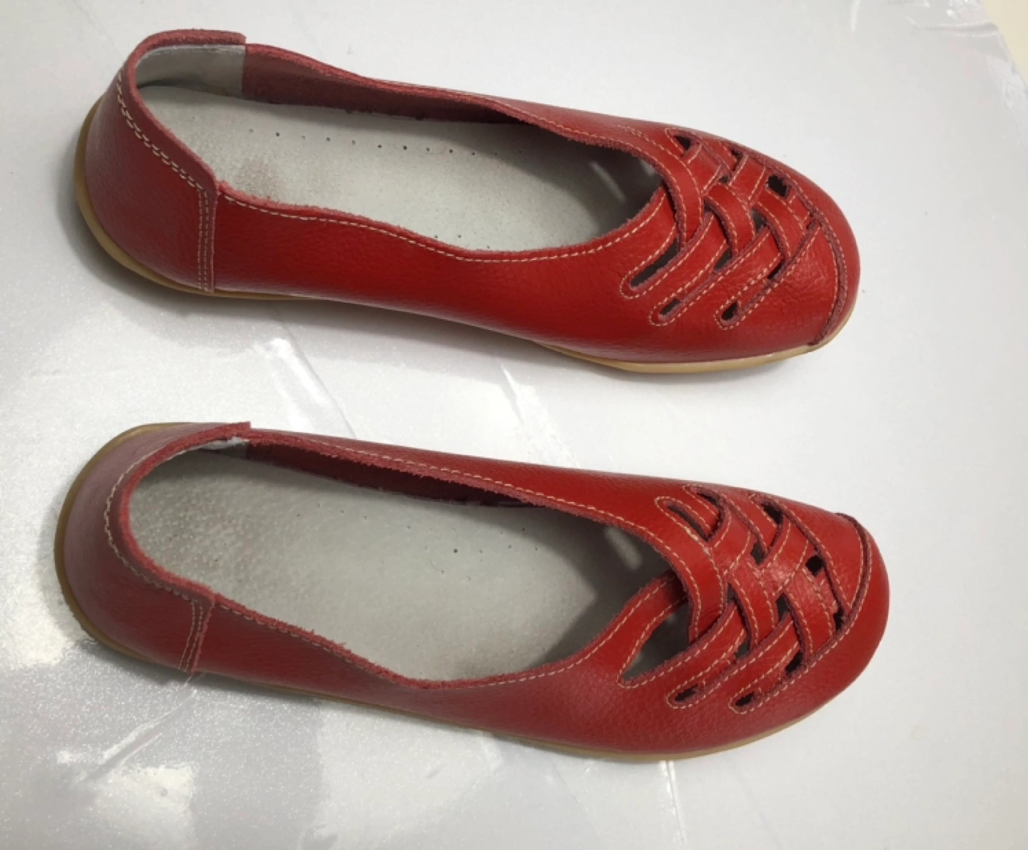 Red leather flats with leather insole and rubber non-slip outsole. Woven detail on front. Rounded toe. Low profile. Size 40 but fit smaller, like size 9 to 9.5 Super comfortable and in excellent condition