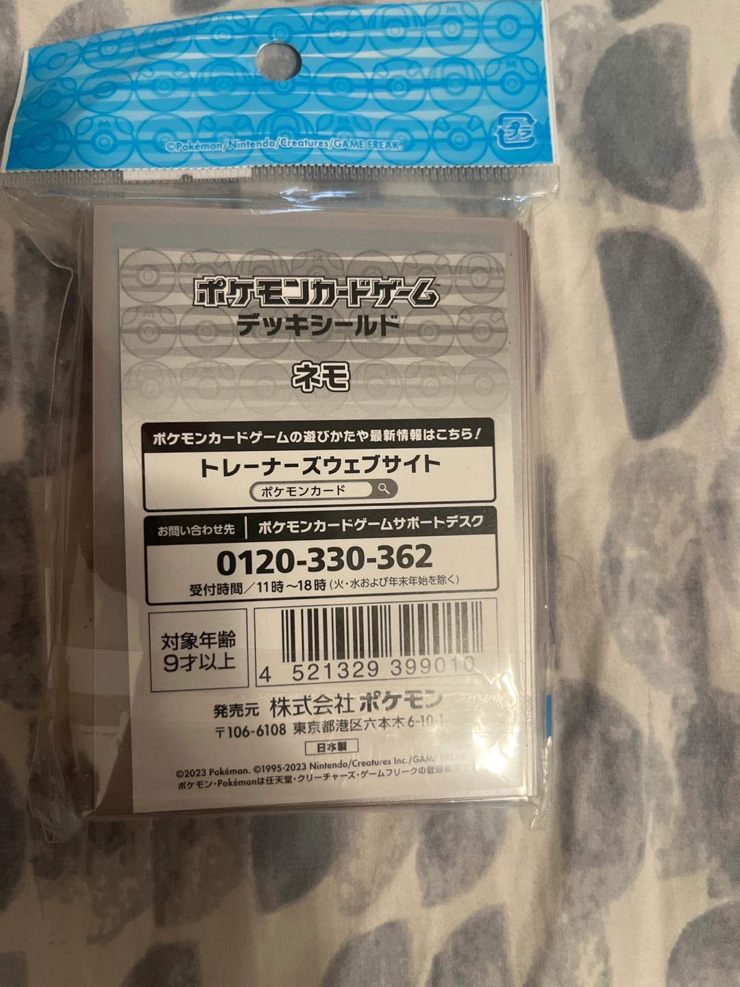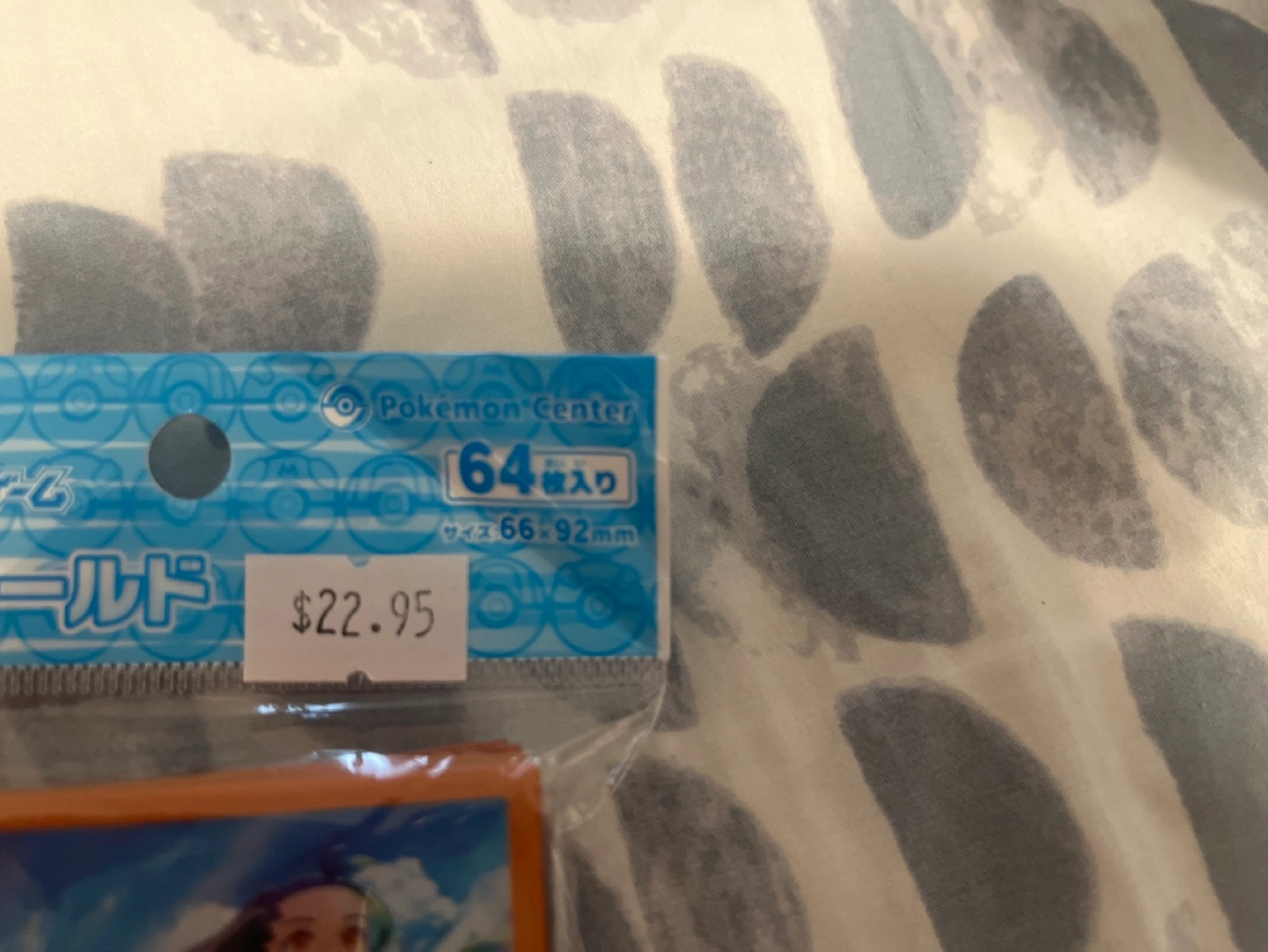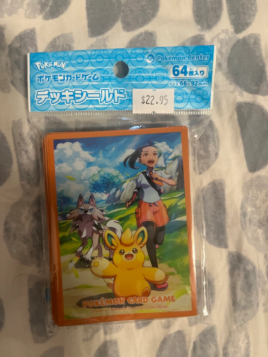 New, unopened package of 64 Pokemon card sleeves. Features artwork of a trainer and Pokemon. Size: 66x92mm. From the Pokemon Center.