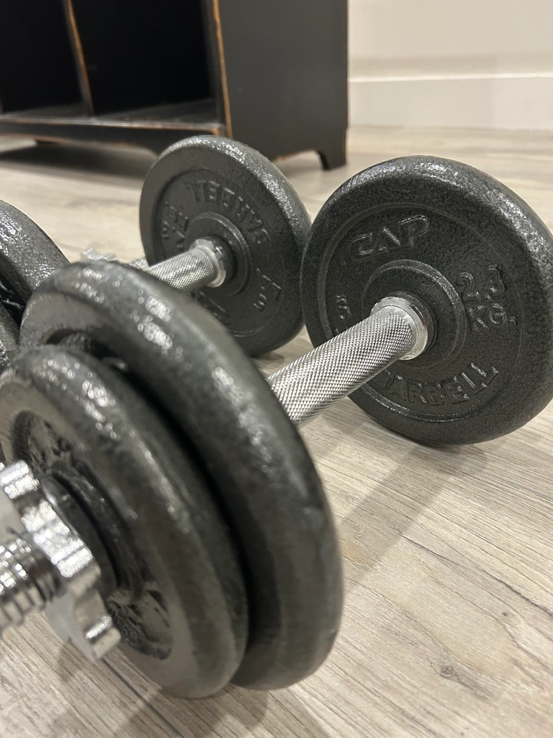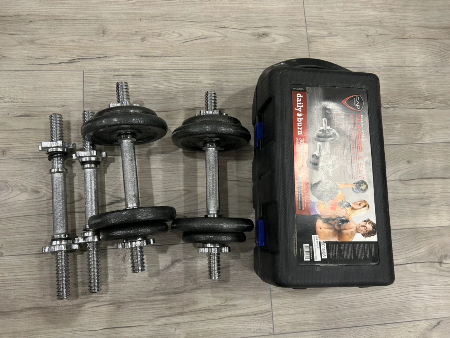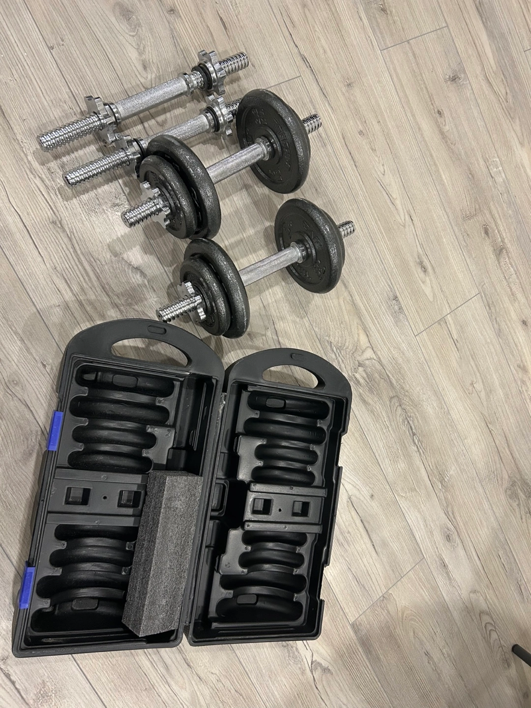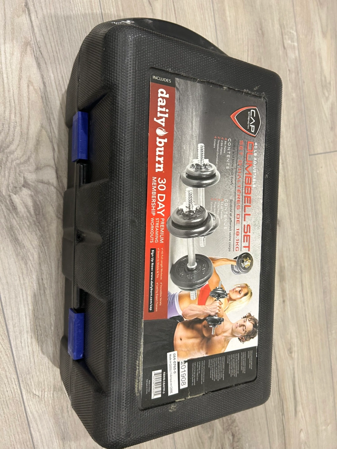 40lb Adjustable dumbbell set. Great for home workouts. Includes: - 4 x 5lb Plates - 4 x 2.5lb Plates - 2 Threaded Dumbell Handles - 4 Collars - Carrying Case