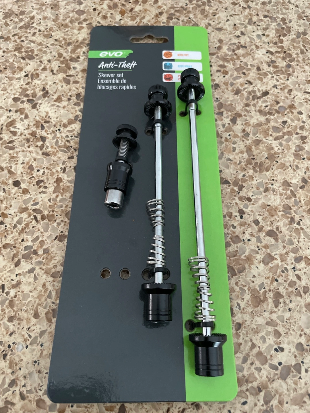 New Evo anti-theft skewers. Includes two skewers, keys, and springs. Chrome finish. Secure your bike wheels.