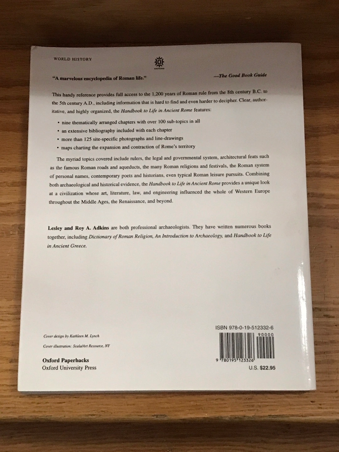 Oxford University Press paperback. Over 100 topics, 125 site-specific photographs and line-drawings, maps charting expansion and contraction of Roman territories. Covers Roman religion, architecture, and more. A marvellous encyclopedia of Roman life. Lesley Adkins & Roy A. Adkins ISBN: 978-0-19-512332-6
