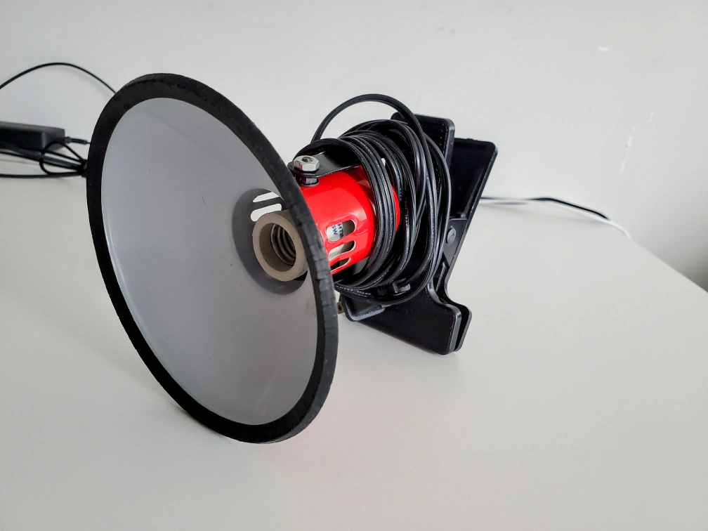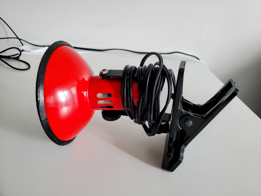 Red metal body, adjustable, black plastic clamp. Grey reflector. Electrical cord included. Great for a workspace or hobby.