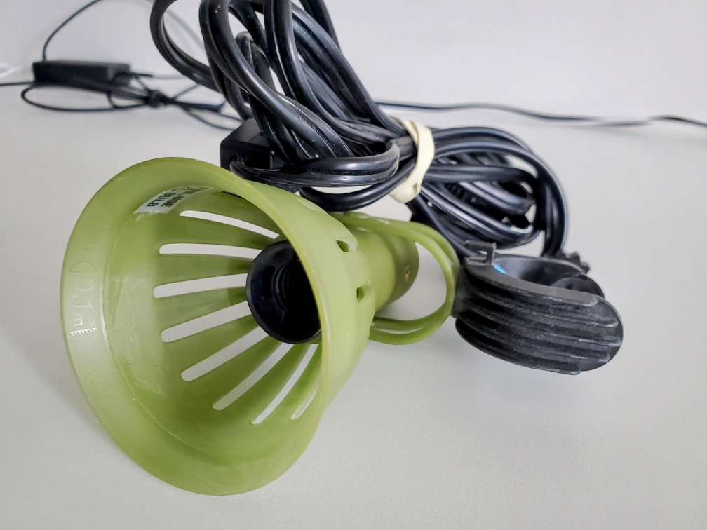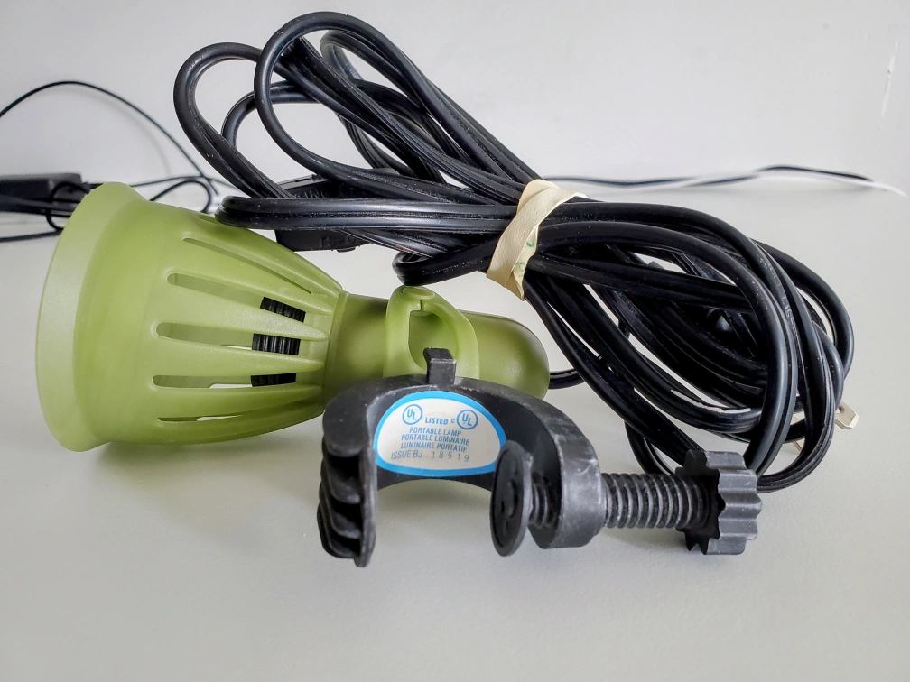 Portable lamp with a clamp. Green plastic housing. Long power cord. Good for reading or task lighting.