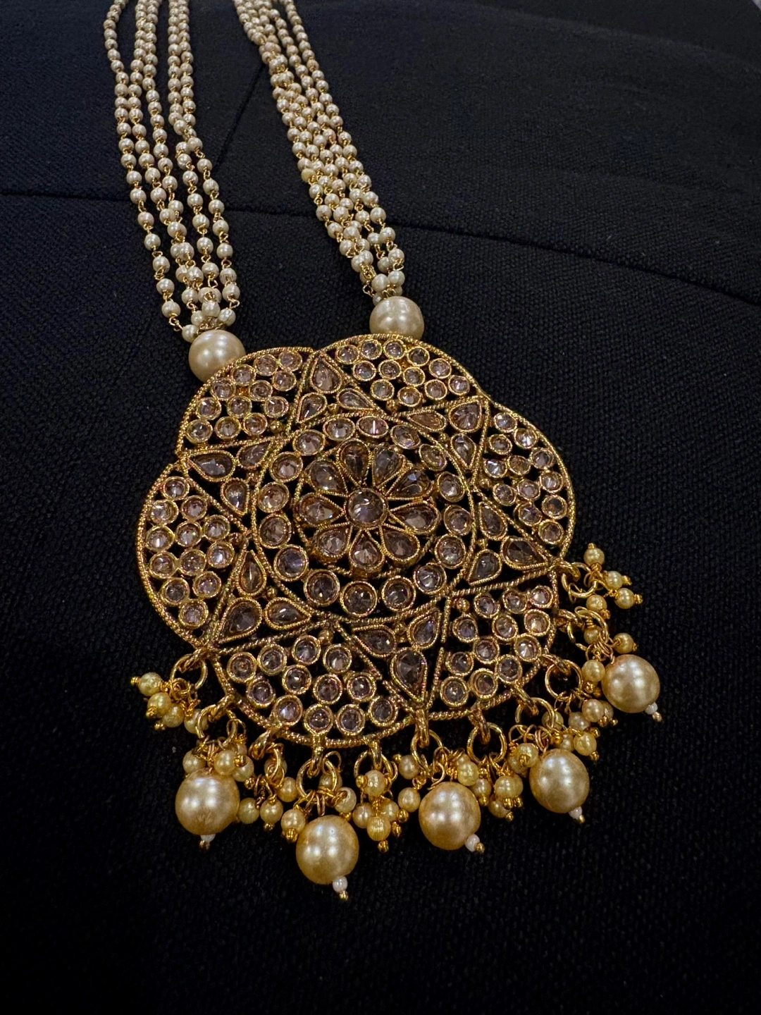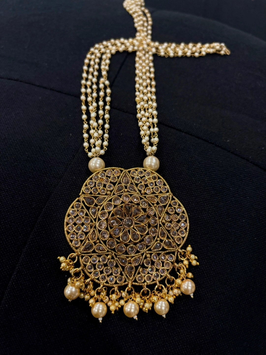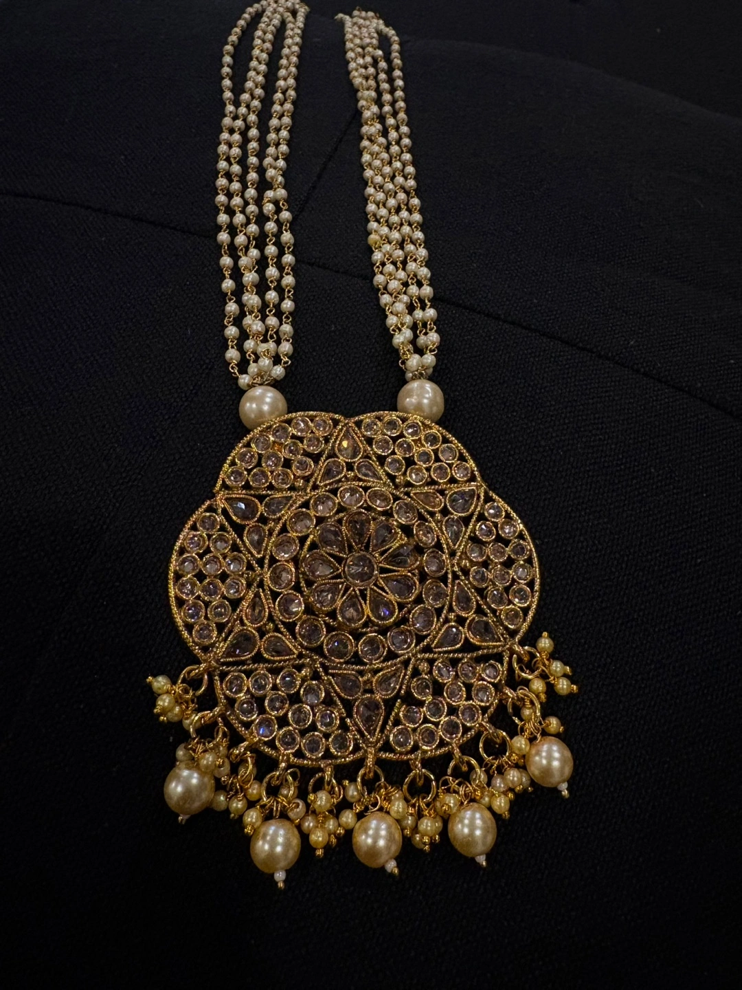 Beautiful necklace featuring a large, ornate pendant embellished with sparkling stones. Long strands of pearls add elegance. Perfect for special occasions.