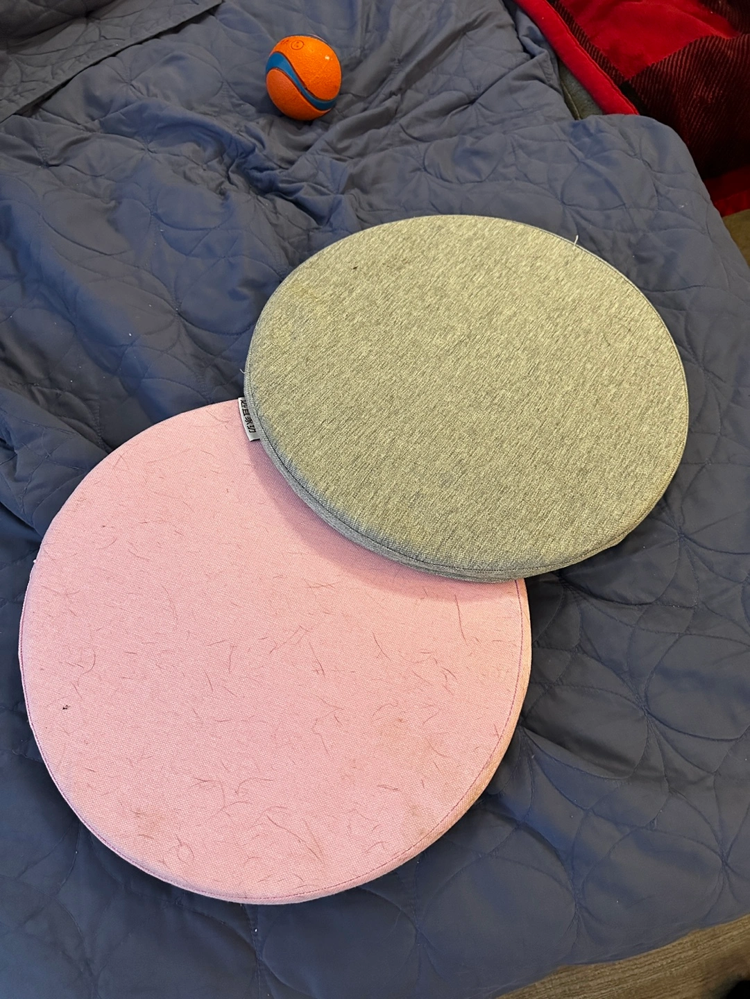 Don’t really need these anymore. 10 dollars for both. I’ll wash them for you before you pick up. It’s memory foam inside. Good for your toasty buns. Or good for your cat to chill on. I once left it on the couch and my cat immediately went on it for a nap. 5 dollars if pick up. Two round cushions, one grey and one pink. Fabric covers.