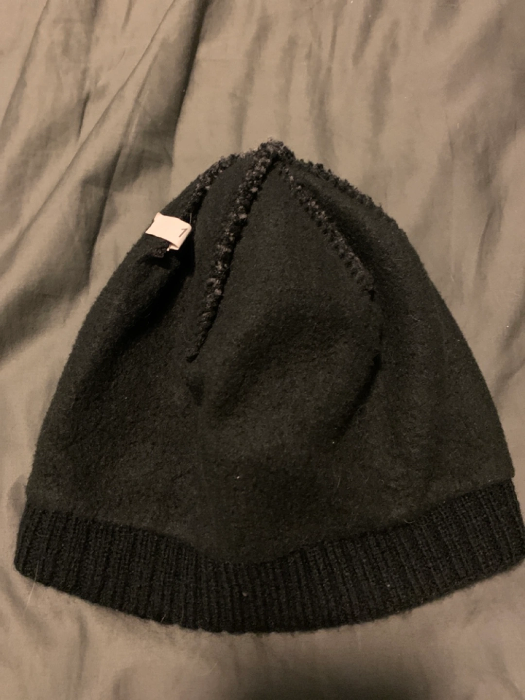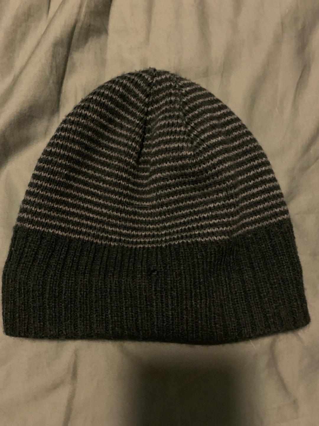 Warm and cozy knit beanie. Grey and black stripes. Perfect for cold weather. Soft material.