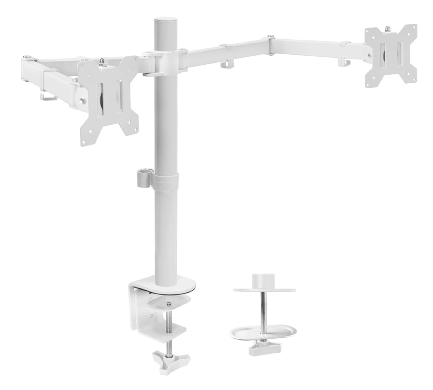 Brand new white dual monitor arms. Comes with a clamp or grommet mount and can hold 13" to 38" VESA compatible screens. Original $75 on Amazon. Check out more details on Amazon. Included all hardware and instructions. https://www.amazon.ca/VIVO-Ultrawide-Adjustable-Computer-STAND-V038/dp/B0CNBXMYTG?th=1