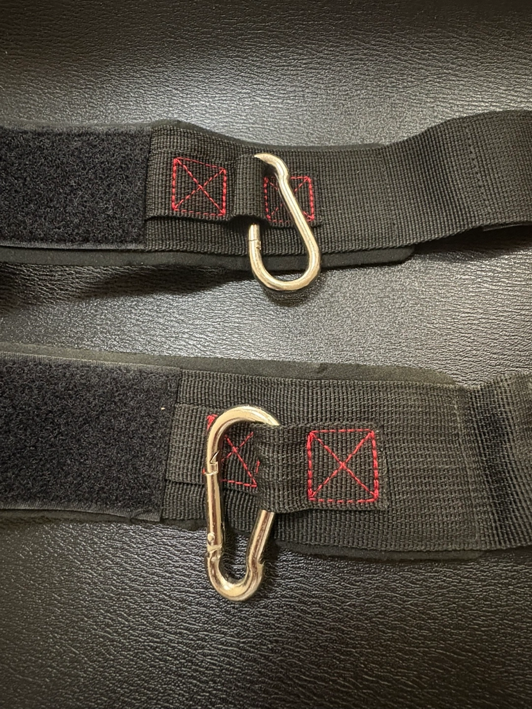 Two black nylon straps. Durable material. Each strap features a metal carabiner clip and hook-and-loop closure. Ideal for suspension training.