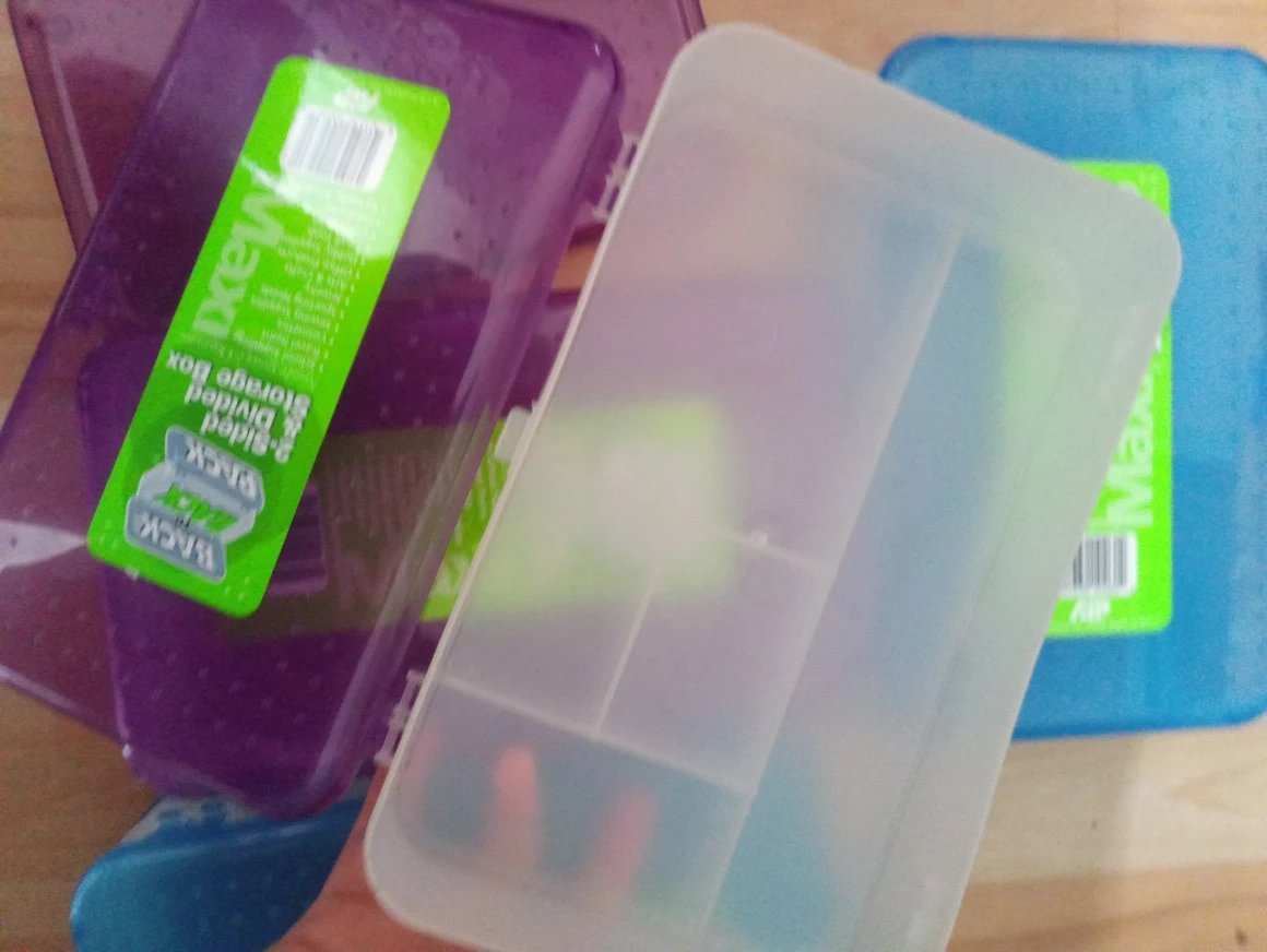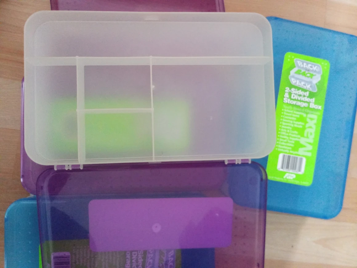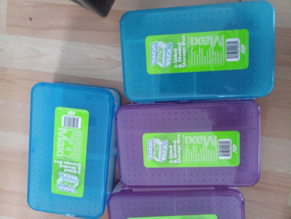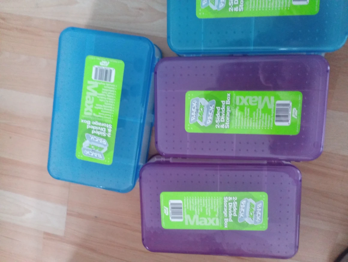 Set of four plastic storage boxes. Two-sided design. Multiple compartments. Ideal for organizing small items. Various colours available.$5 for 4
