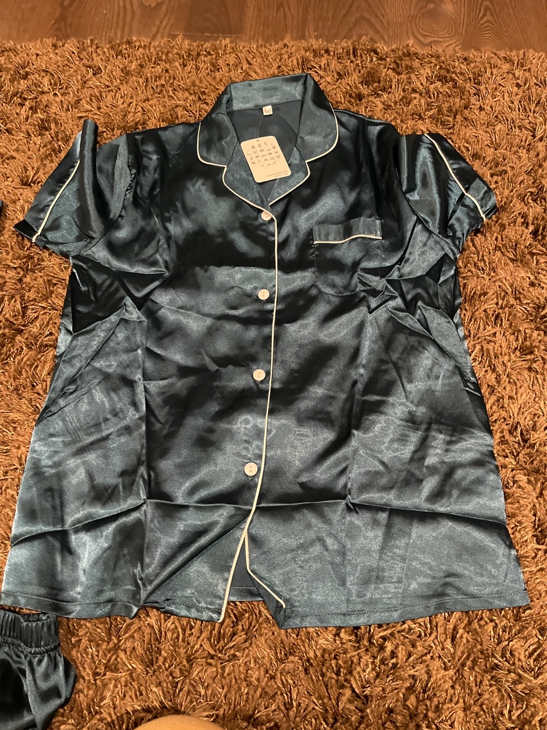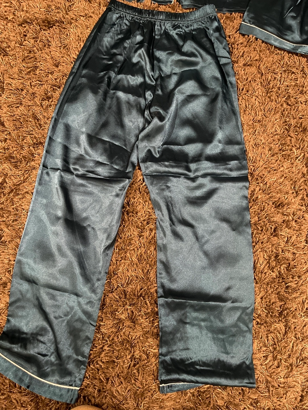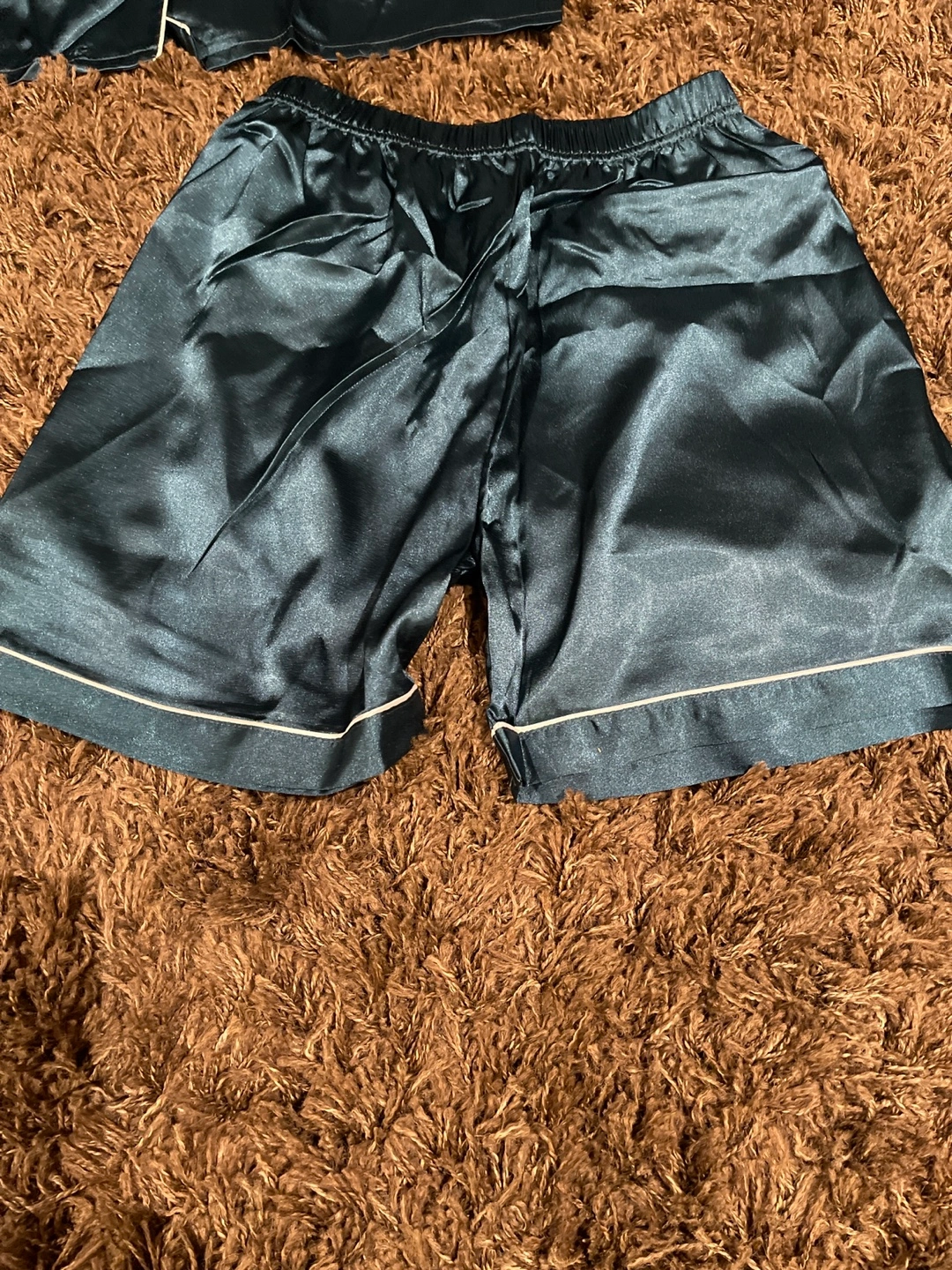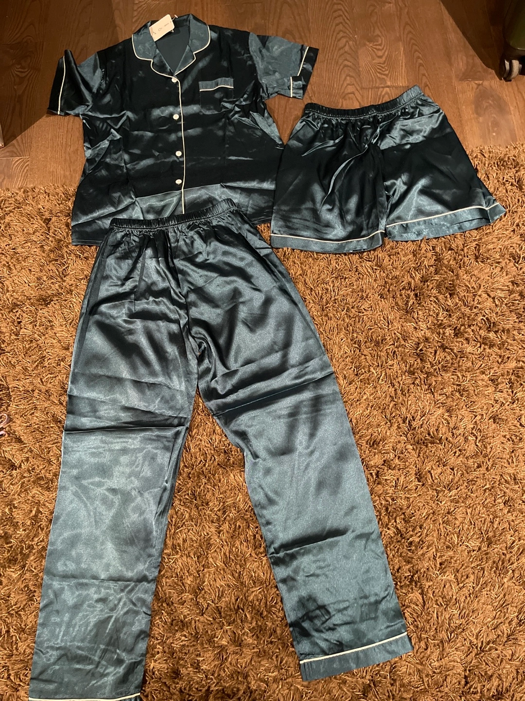 Dark green satin three piece pajama set. Includes a collared short-sleeved shirt, shorts, and long pants. Soft and comfortable material. Perfect for lounging or sleeping.