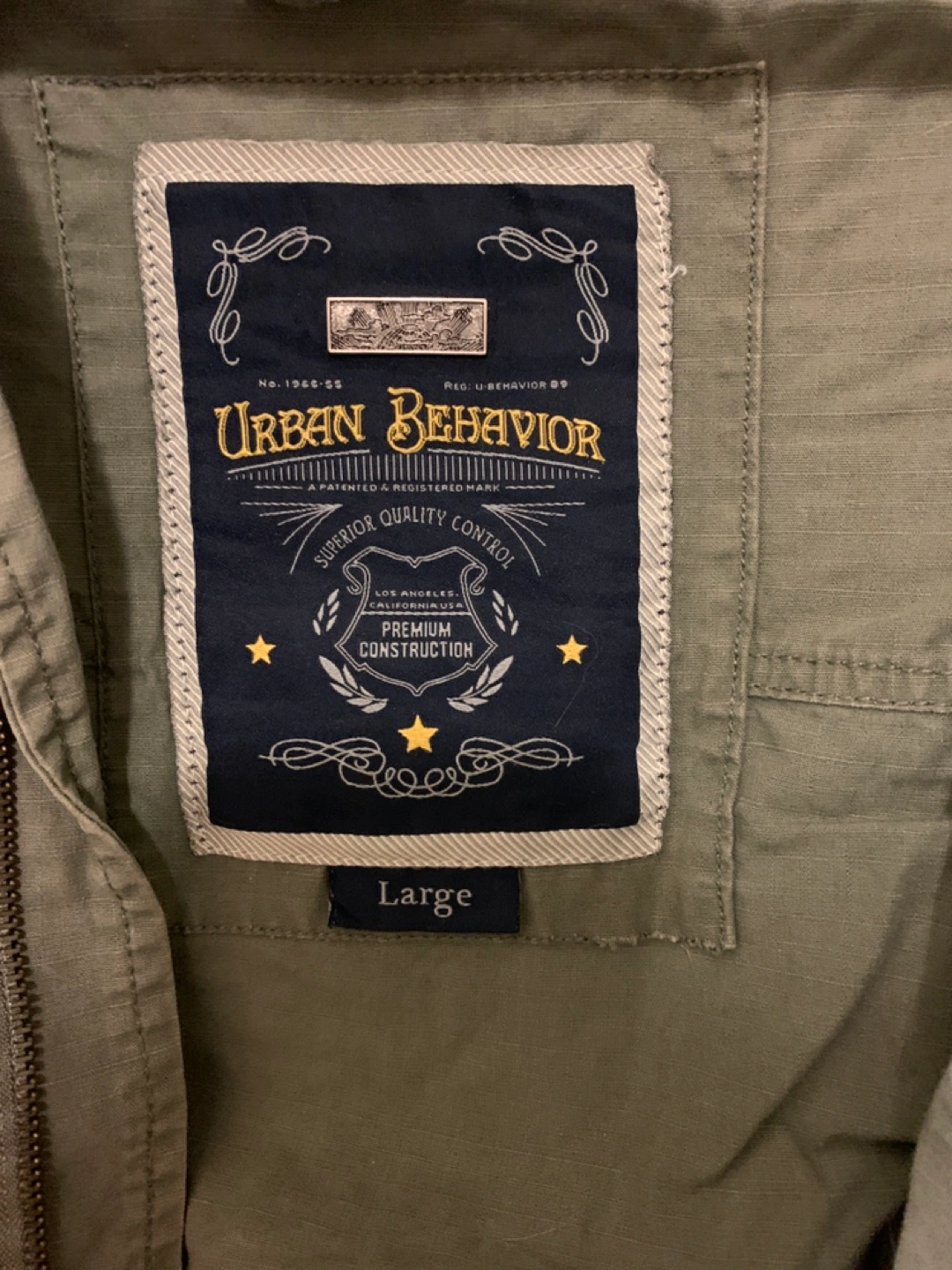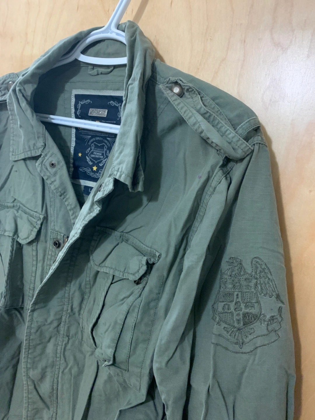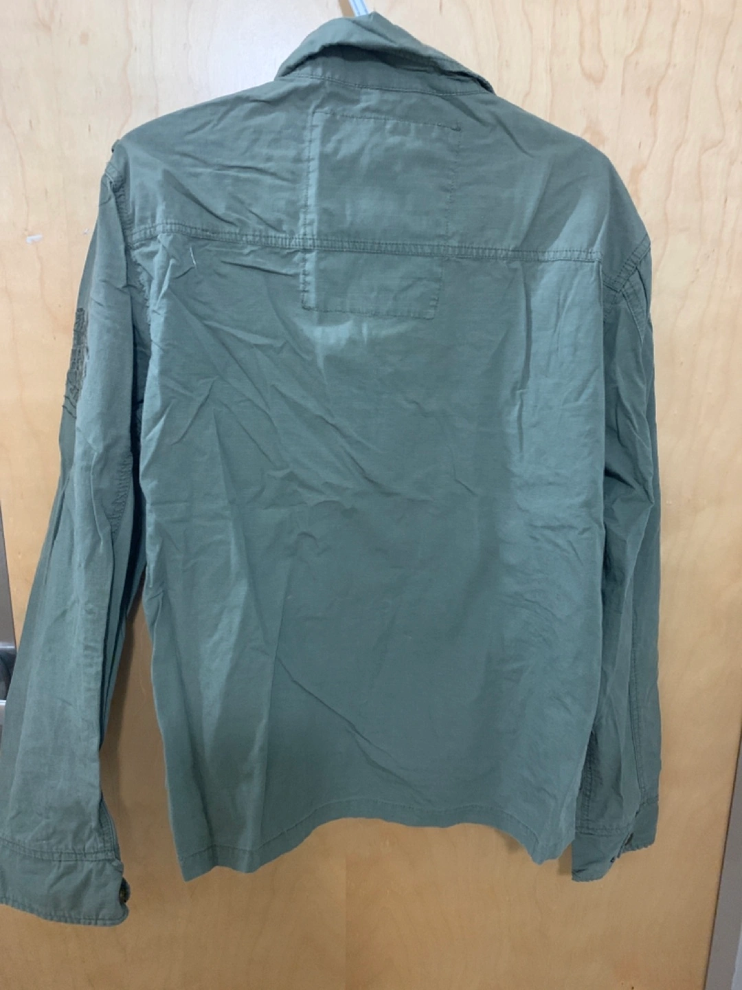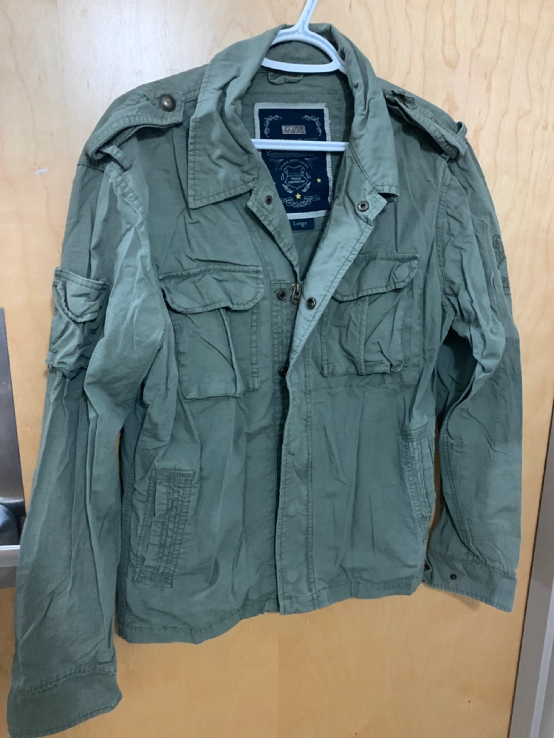 Men's olive green utility jacket. Size large. Features multiple pockets and embroidered details. Long sleeves. Zip and button closure.