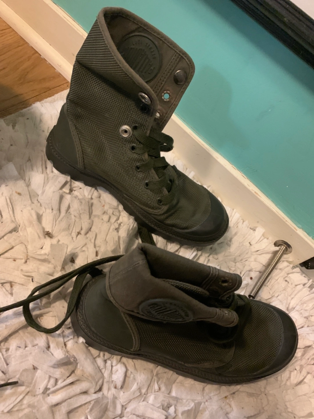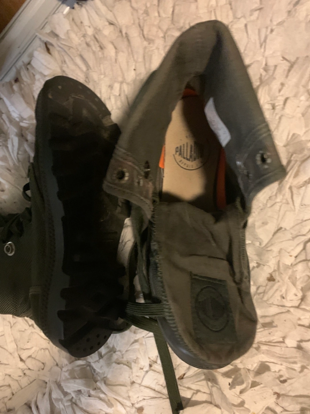 Pair of olive green Palladium high-top canvas boots. Lace-up closure. Durable rubber sole. Worn 2x