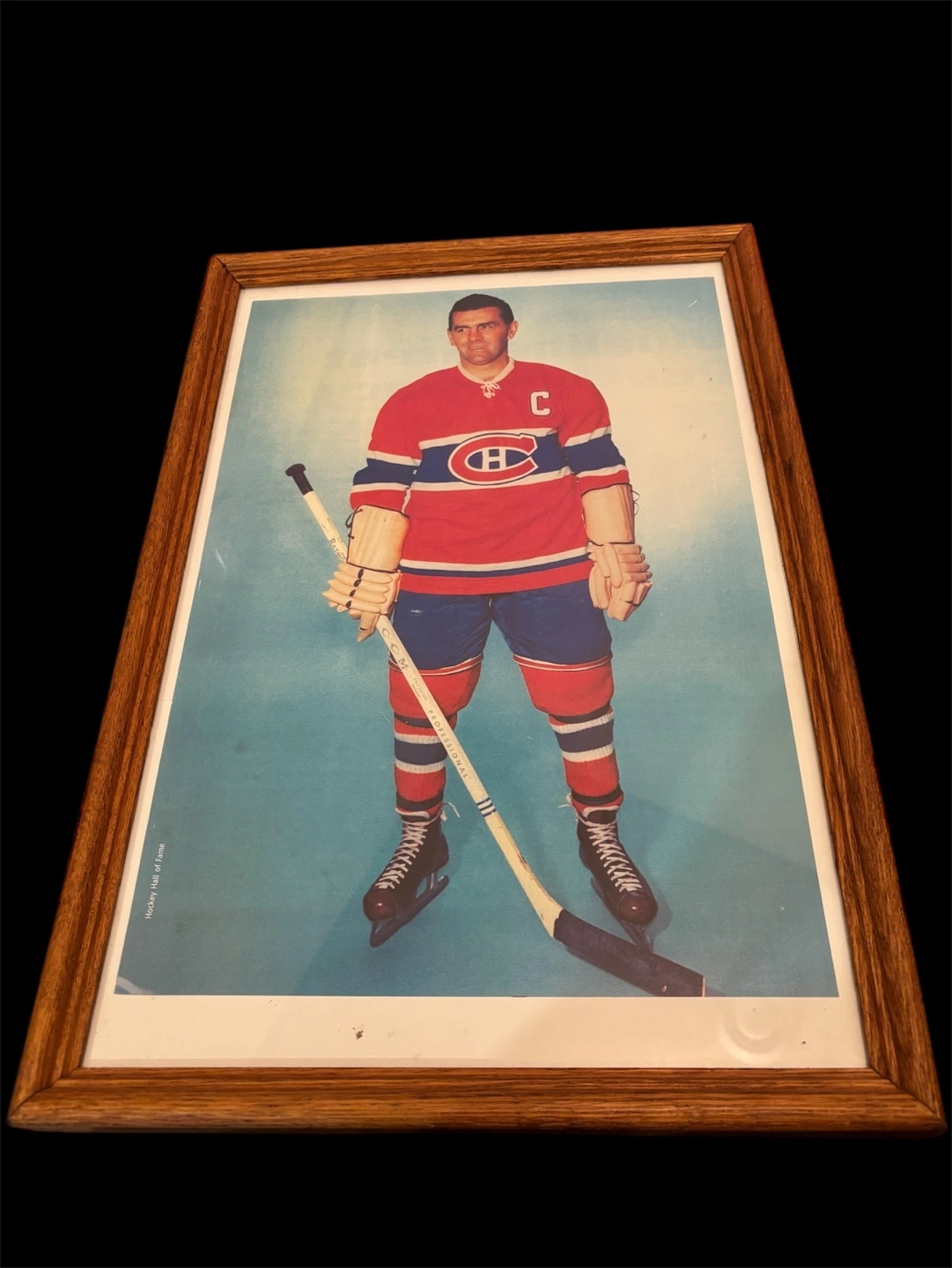 Framed photo of a Montreal Canadiens hockey player. Features a player in a red and blue uniform. Wooden frame. Collectible memorabilia.