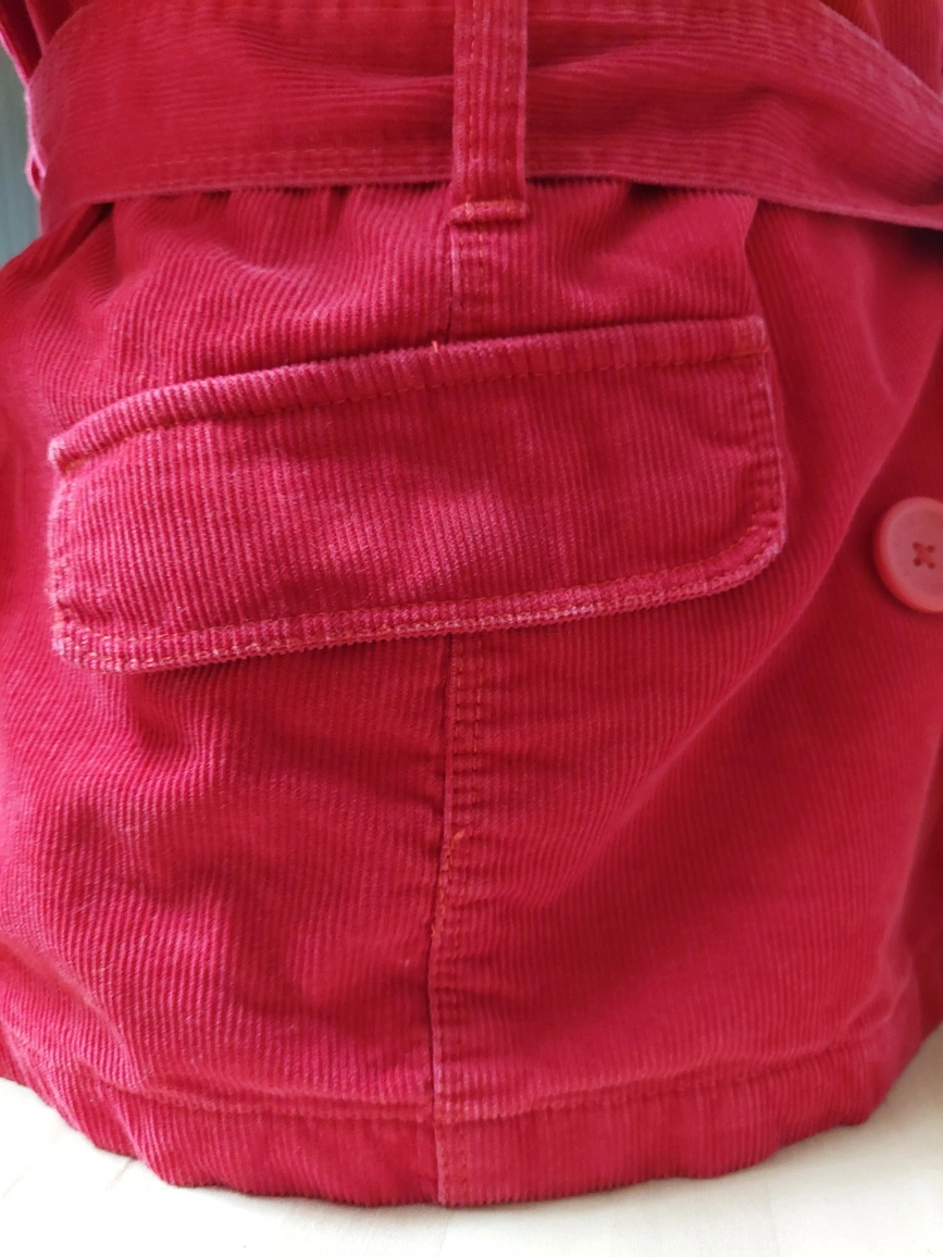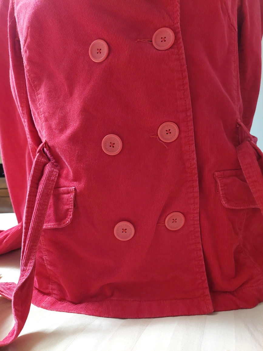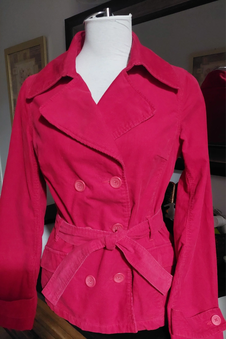 Women's Red corduroy jacket. Double-breasted style. Features a belt and 2 pockets. Size EUR 42/ medium. 100% cotton shell. Recently laundered. From smoke and pet - free home. Please browse through my other listings. Discount applies to bundling.