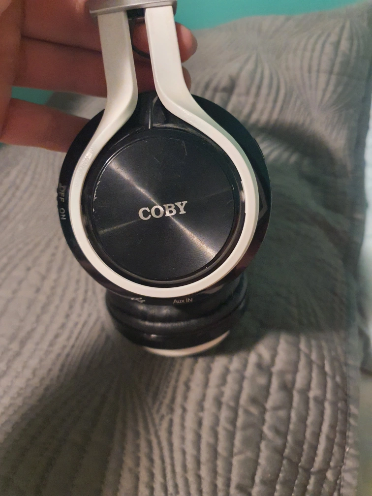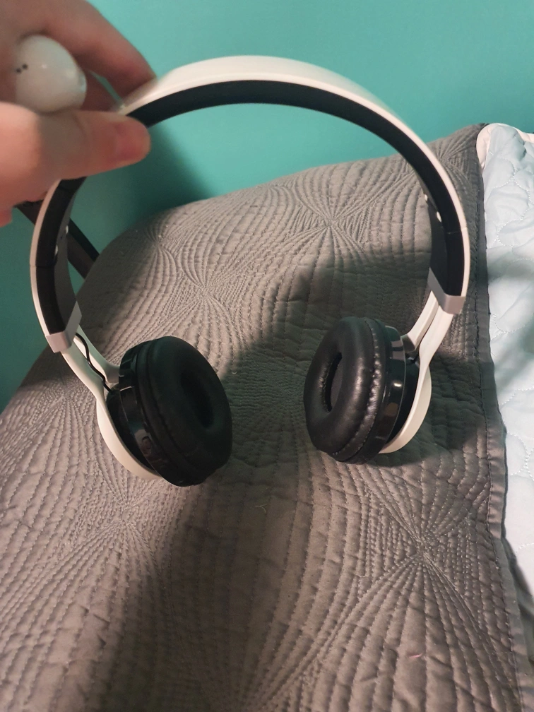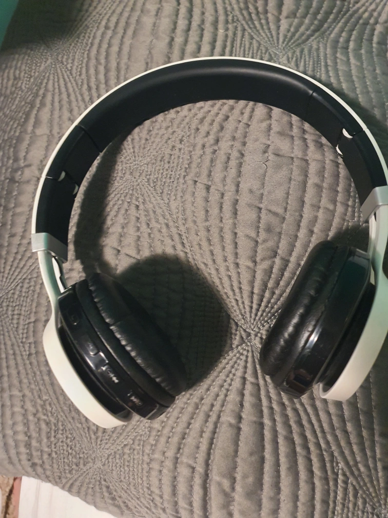 Wireless headphones, black and white. Foldable design. Good for listening to music or podcasts. Includes aux input.